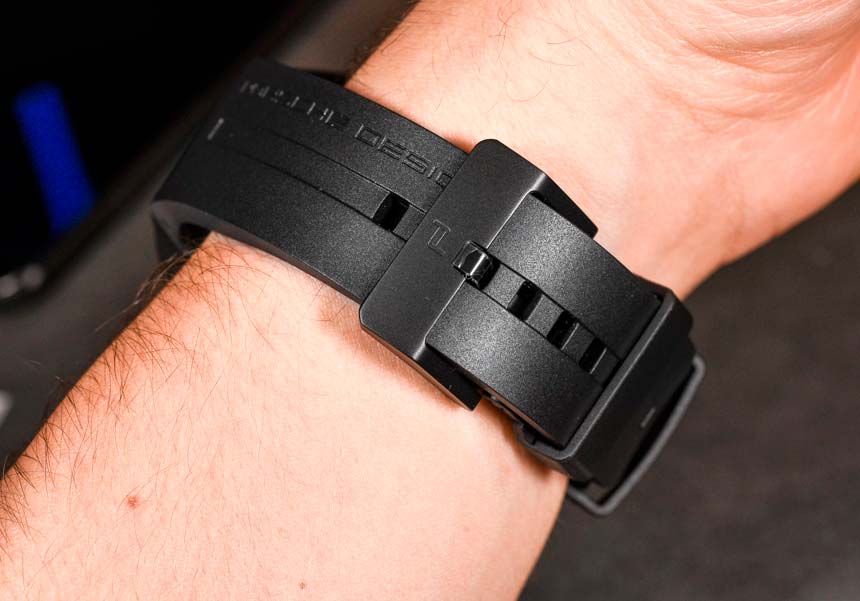 Для начала, новые часы Porsche Design Monobloc Actuator Chronograph выполнены в титановом корпусе шириной 45,5 мм и толщиной 15,6 мм. Это отнюдь не маленькие часы, но благодаря титановой конструкции они ощущаются относительно легко, хотя и занимают все запястье.