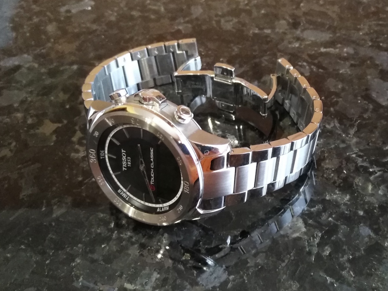 Модель серии T-TOUCH Classic именно с таким циферблатом, существует только с кожаным ремешком. Для изменения внешнего вида часов и улучшения их практичности и гигиенических свойств (особенно летом), в официальном сервисном центре TISSOT в Киеве, был заказан оригинальный металлический браслет от часов этой серии (T-TOUCH T083.420.11.057.00) стоимостью ~120$.