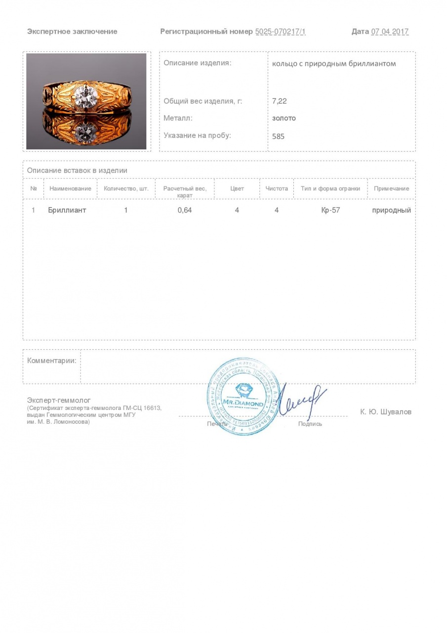 Узорное золотое кольцо с бриллиантом 0.64ct