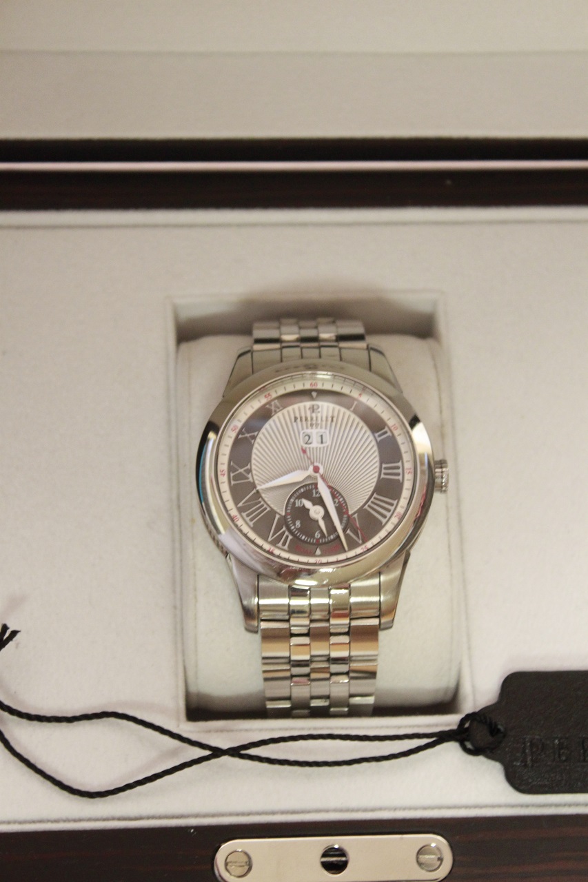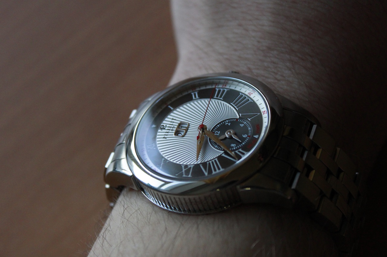 Красивейшие Perrelet. Накладная окантовка с римскими цифрами выделяет циферблат на фоне корпуса и браслета. Гильошированная центральная часть циферблата, второй часовой пояс, большая двойная дата делают эти часы очень интересными и заметными!