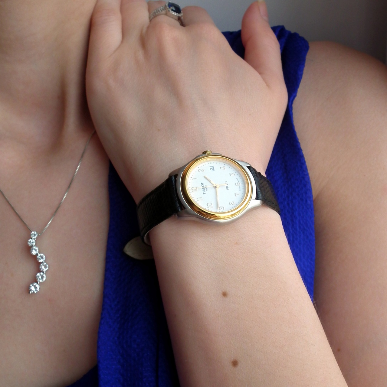 Великолепная женская классика с круглым циферблатом от Tissot - модель PR50 с белым циферблатом в серебристо-золотистом окаймлении.