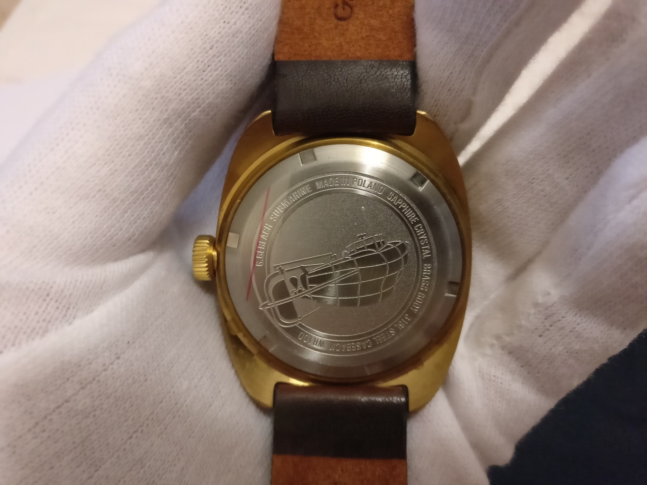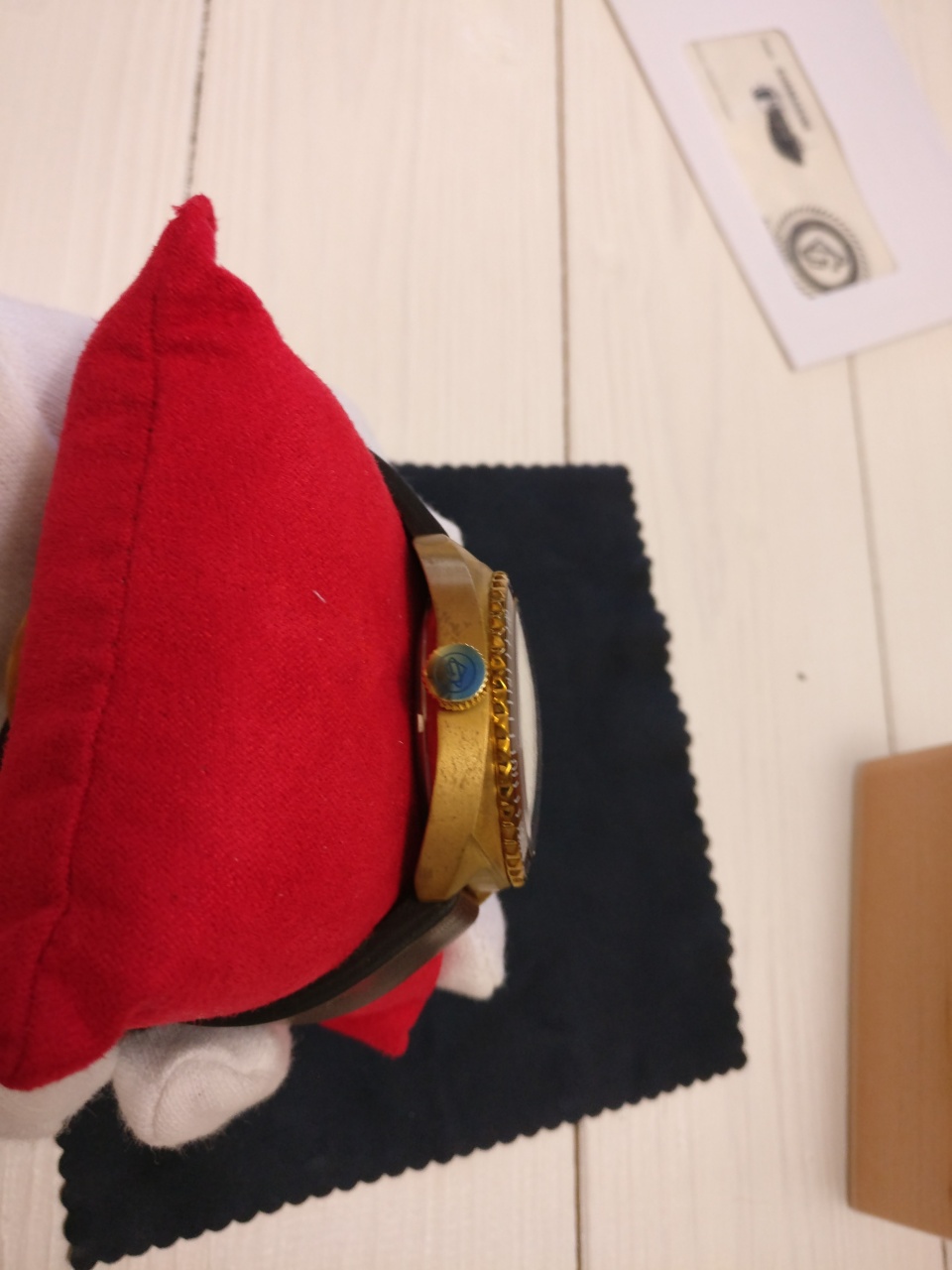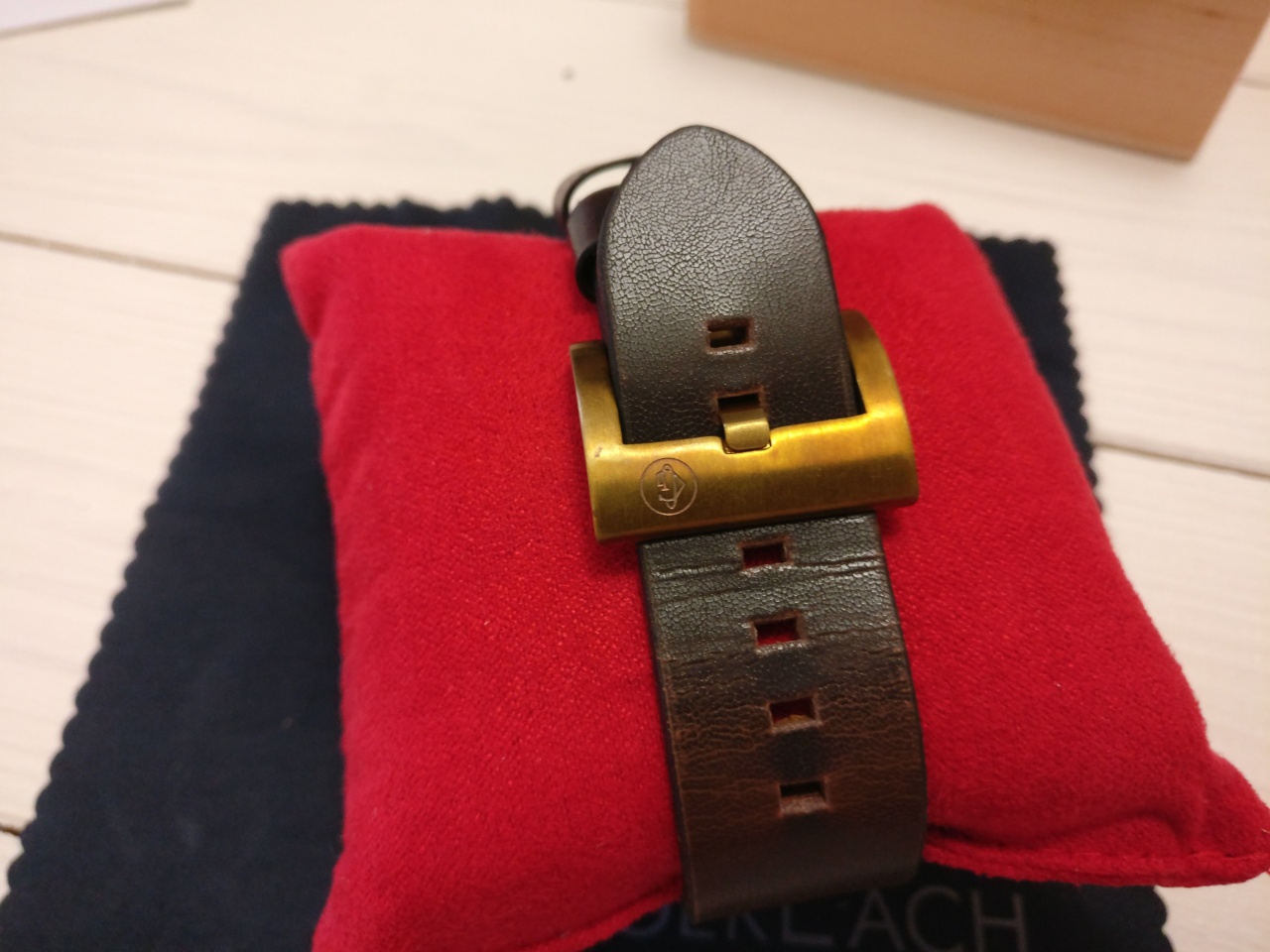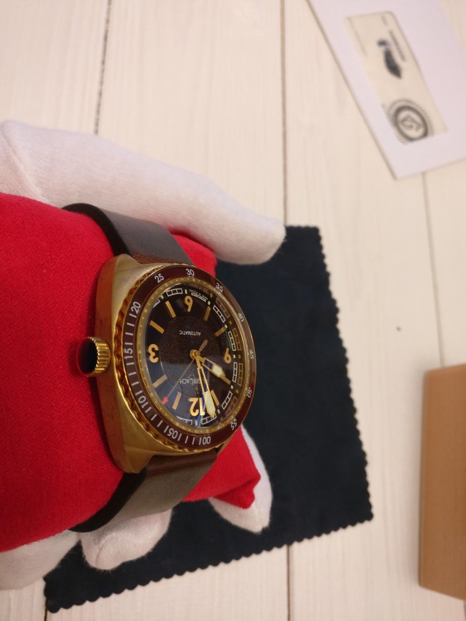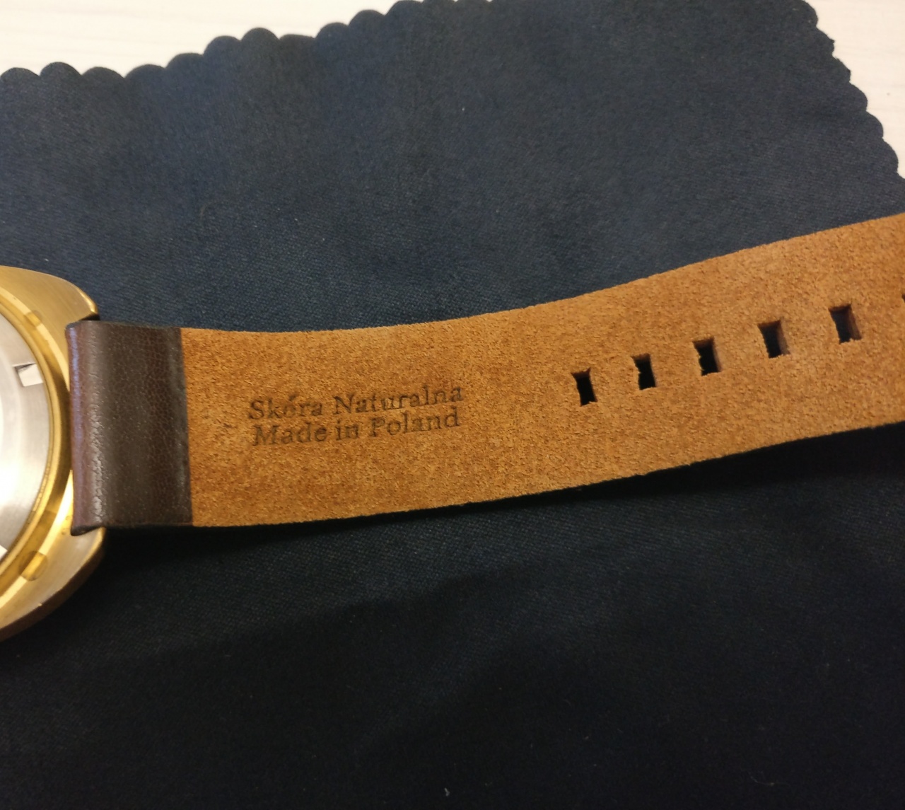 Очень красивый корпус из латуни, патина будет потрясающая. В комплекте очень мягкий и комфортный ремень из кожи.