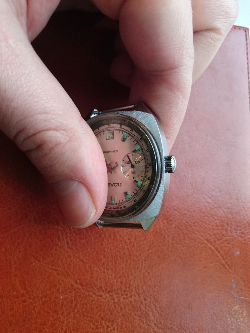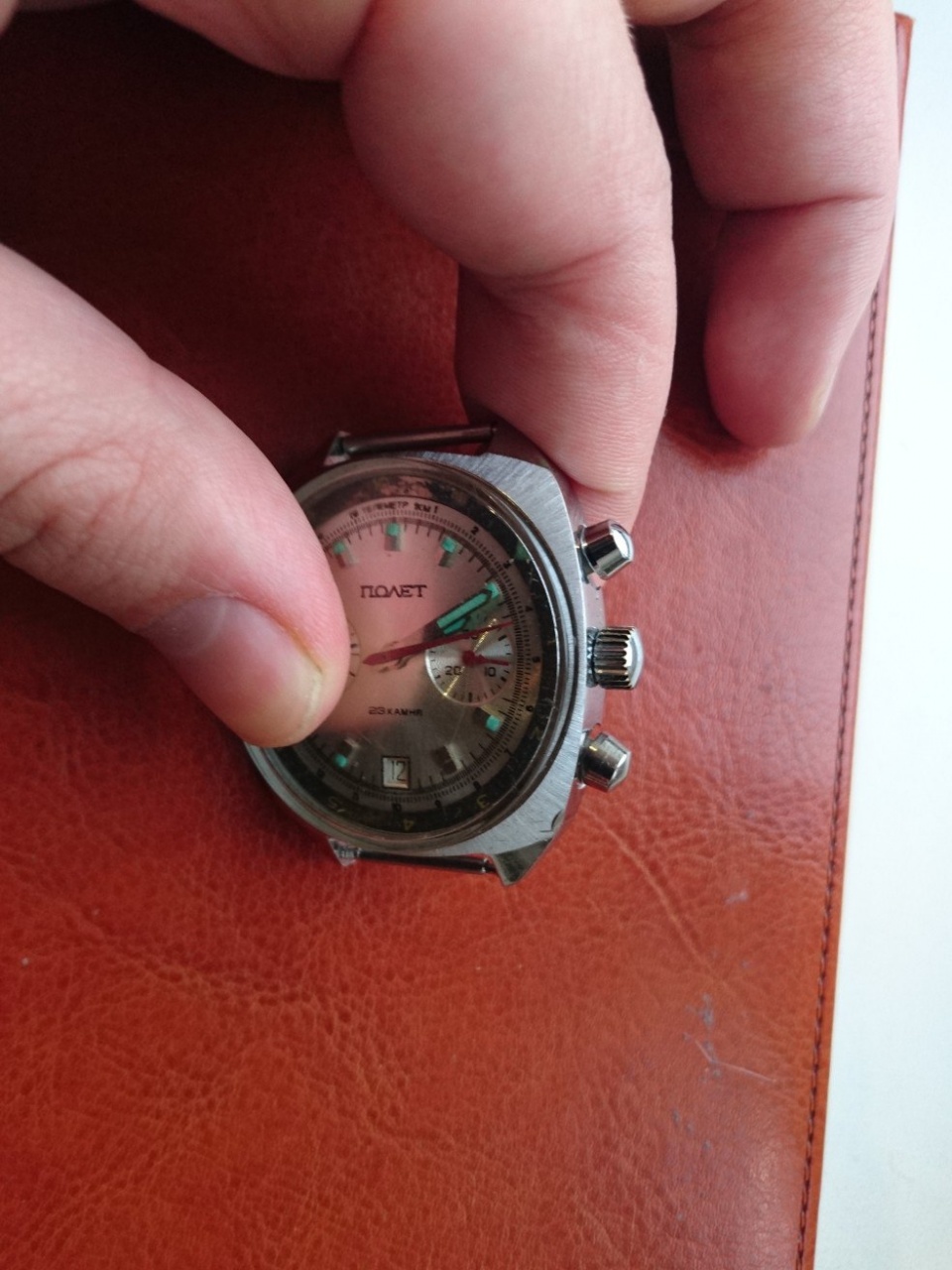Полет 23 камня 3133 (штурманские) гражданский хронограф. Корпус хром, часы рабочие, но требуют регулировки, хронограф сбрасывается не на 0, а на 10, верхний рычаг туго нажимается. Кнопки не облезлые, снизу корпуса возле крепления браслета есть маленькие царапины. Ход бодрый и точный. Рант обсыпался, нужна замена и стекло выпадает нужно посадить на клей. Циферблат в идеале. Цена обсуждается.