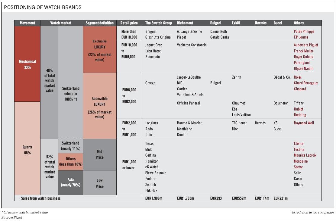 Грегори Понд, обозреватель Business Montres и один из самых авторитетных журналистов в часовой индустрии составил свой рейтинг только среди часовых брэндов. Стоимость марки он основывал на следующих критериях: объем оборота, сеть дистрибуции, потенциал роста, креативность команды и эффективность менеджмента и наконец целевая группа покупателей.