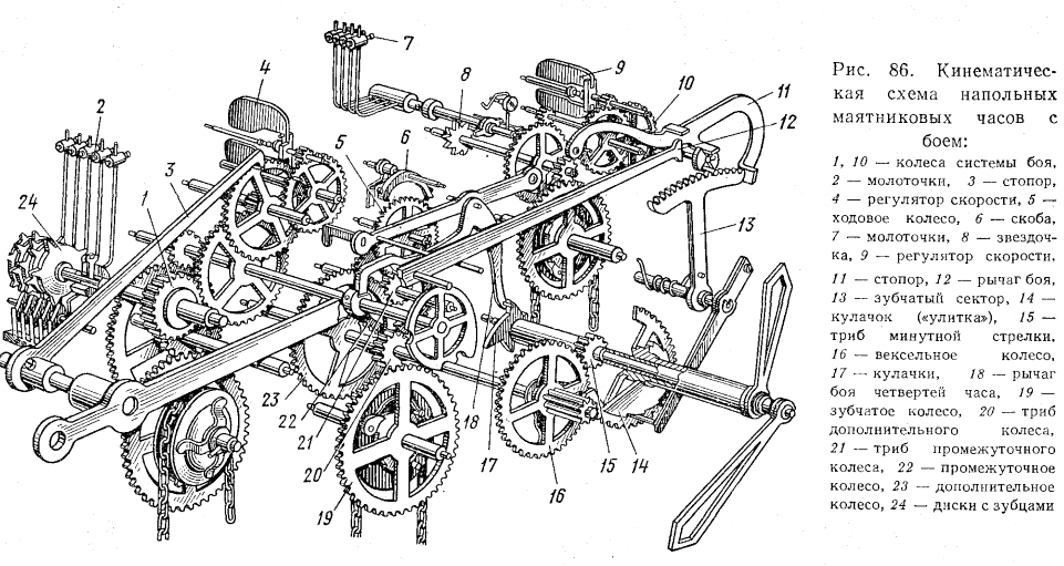 Вот тема по этим часам: http://forum.watch.ru/showthread.php?t=133103 Хороший рисунок этого механизма приведён в книге Поповой и Гольдберг "Устройство и технология сборки часов", но вот описание его работы там крайне безграмотное, читать не советую, чтобы не запутаться. Изучите принцип работы четвертного боя (он одинаков у большинства подобных часов), тогда сами во всём разберётесь.