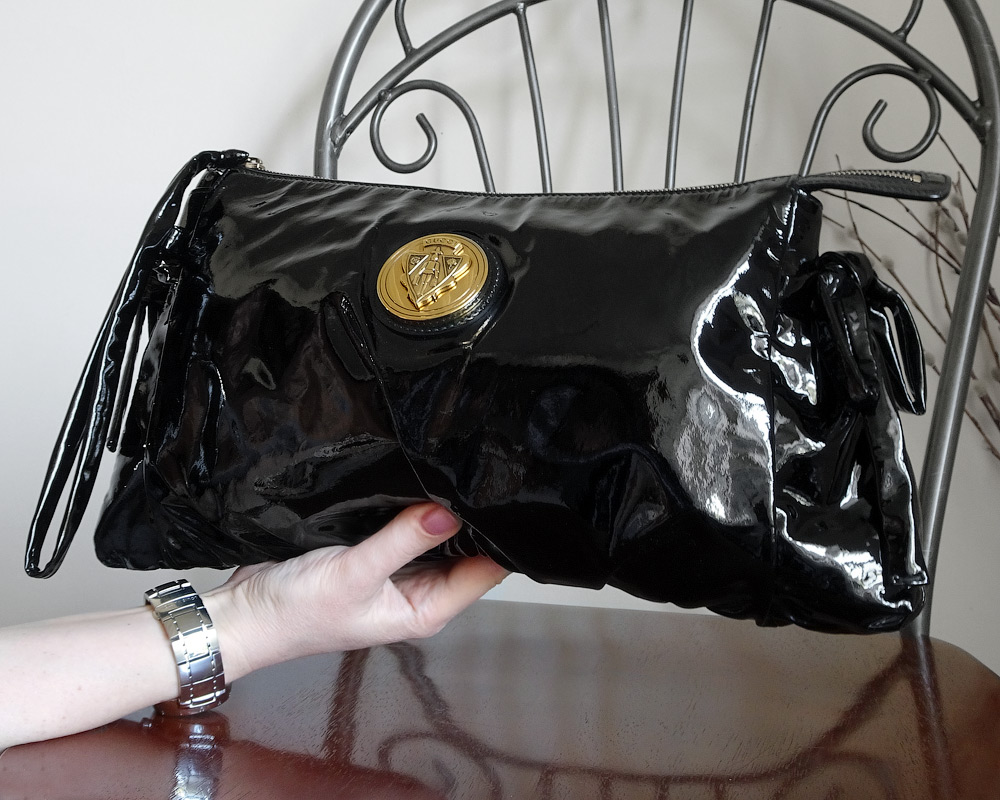 Красиво и изящно оформлен - черная лаковая кожа элегантно драпирована в сборки, по бокам кожаные банты. Клатч украшен крупной круглой эмблемой Гуччи золотистого цвета.