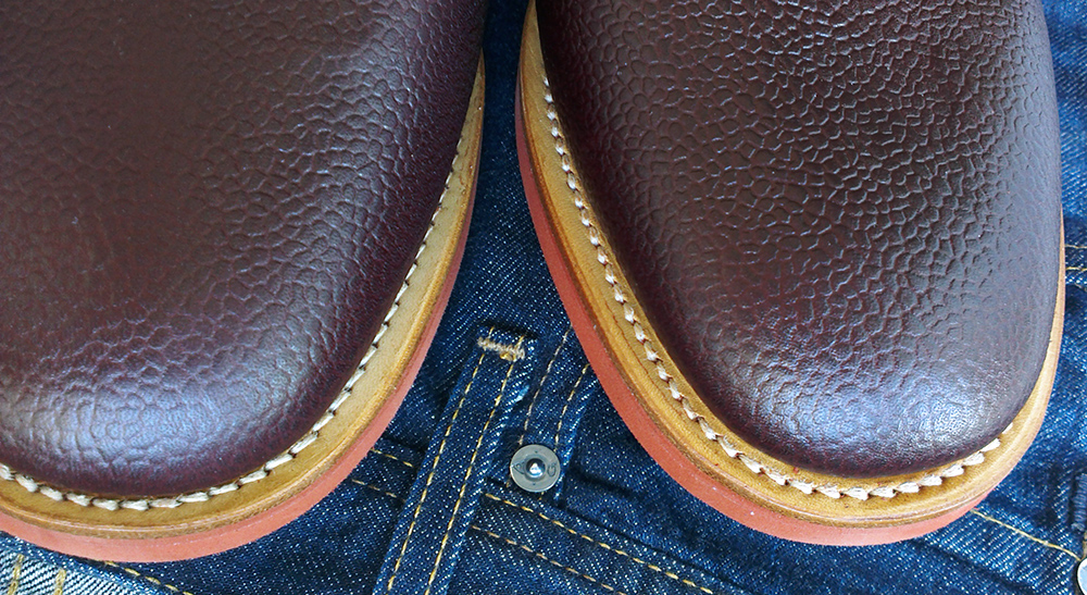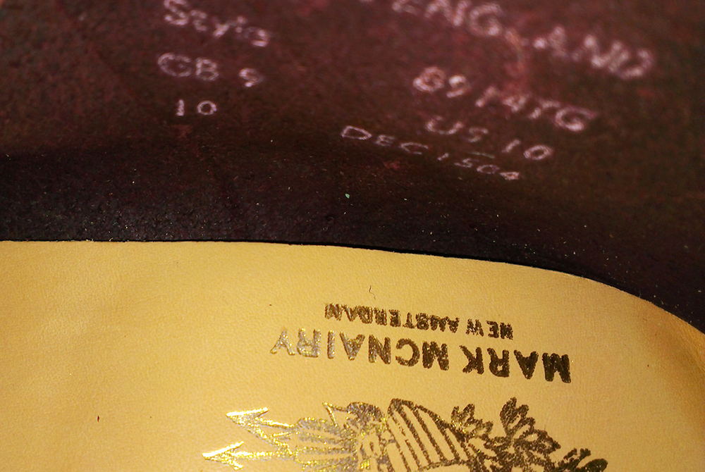 Сделаны в Англии. Полностью отсутствует подкладка и все внутреннии структурные элементы. Верх из толстенной (около 2,5 мм) full grain кожи, на которой прессом выдавлена текстура. Кожа мягчайшая, как и сами ботинки. Толстая кожаная стелька. Конструкция крепления к подошве goodyear welted. Очень лёгкие по весу.