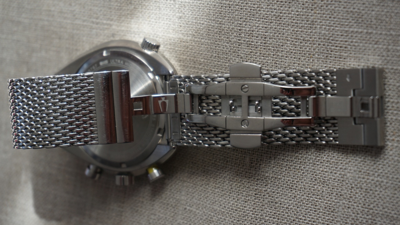 Отличный кварцевый хронограф на элегантном браслете с уникальным фирменным высокочастотным механизмом UHF с частотой импульса 262kHz, дающим плавный ход секундной стрелки.