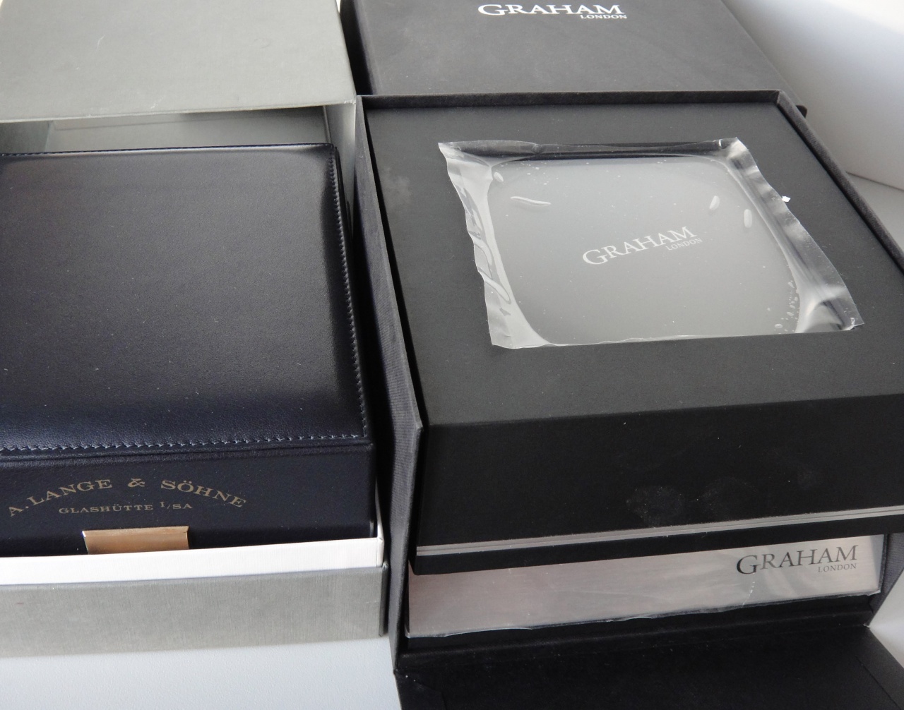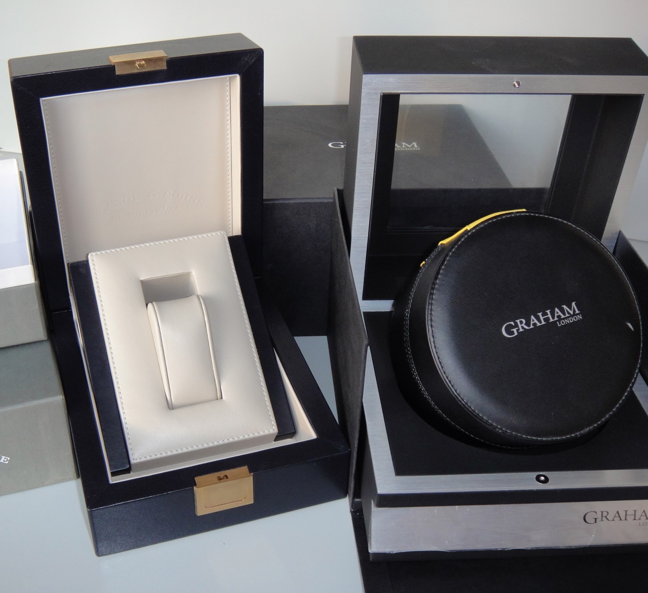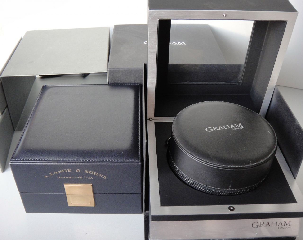 состоит из внешних картонных коробок черного цвета + основная внутренняя коробка из дерева, стекла и алюминия (ВСЕ В ЗАВОДСКИХ ПЛЕНКАХ) + внутренняя круглая кожаная черная коробка-переноска из кожи на молнии. На черной коже есть маленький заводской дефект,не существенный. По желанию Покупателя , могу заменить кожаную круглую черную коробку - переноску на такую же ЗЕЛЕНУЮ , оригинал GRAHAM, без дефекта.