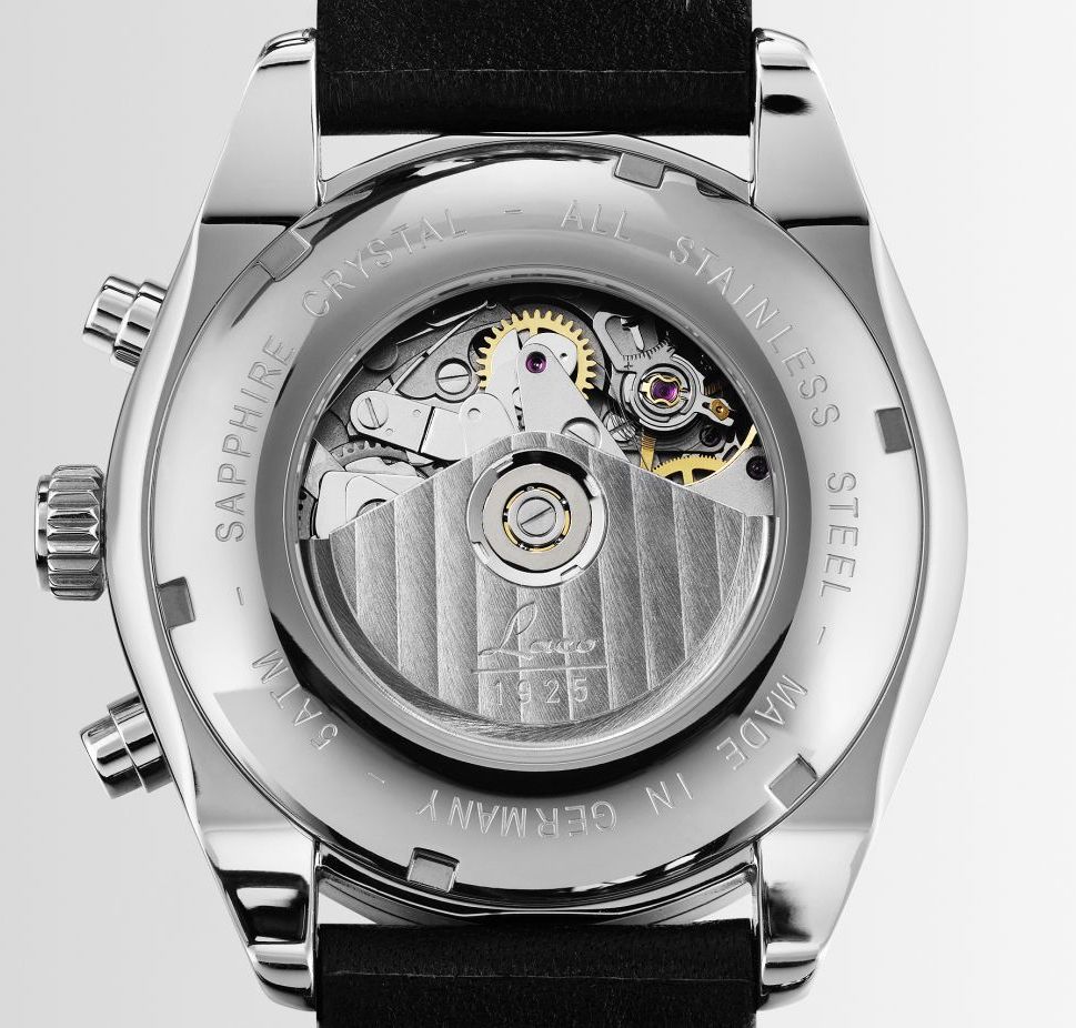 Новинка имеет круглый корпус с полированными и сатинированными поверхностями, изготовленный из нержавеющей стали, диаметром 44,0 мм, водонепроницаемый до 50 метров. На торце рифленой заводной головки, расположенной на 3 часах, выгравирован логотип бренда Laco. Пушеры хронографа размещены на 2 и 4 часах. Сапфировое стекло установлено на передней стороне часового корпуса (выпуклое, с антибликовым покрытием) и на его завинчивающейся задней крышке. Матово-черный циферблат с с накладными арабскими цифрами и продолговатыми часовыми индексами, покрытыми, как и стрелки (в том числе часовая и минутная, выполненные в листьевидной форме) оюминесцентным составом белого цвета. Модель оснащена швейцарским автоматическим механизмом Laco 50 (базовый калибр ETA Valjoux 7750) с функциями индикации часов, минут (посредством соответствующих центральных стрелок), секунд (на соответствующем малом боковом циферблате, расположенном на 9 часах), даты и дня недели (посредством соответствующих цифрового и буквенного указателей в сдвоенных прямоугольных апертурах, расположенных на 3 часах), а также с хронографом (центральная секундная стрелка, круглый аналоговый 30-минутный счетчик, расположенный на 12 часах, круглый аналоговый 12-часовый счетчик, расположенный на 6 часах).