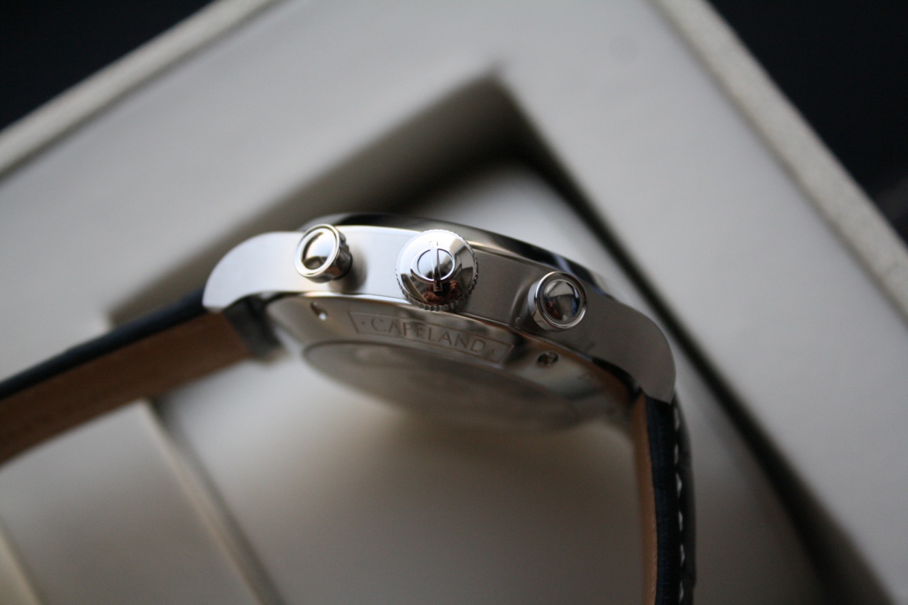 Трёхсекционный хронограф, тахиметрическая шкала, телеметрическая шкала, окошко даты между метками «4-5 часов», прозрачная задняя крышка