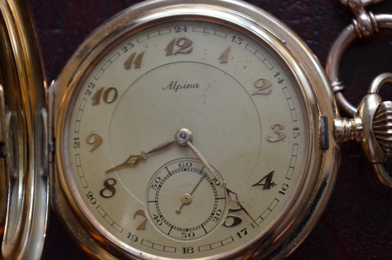 Золотые карманные часы с цепочкой Alpina и наручные Silvana