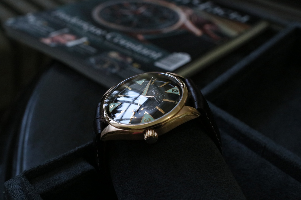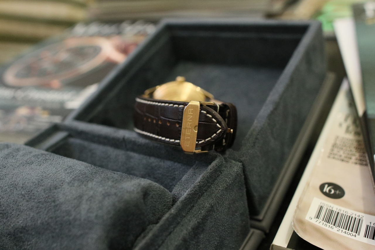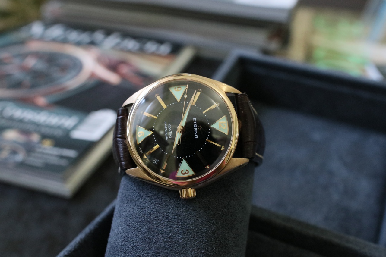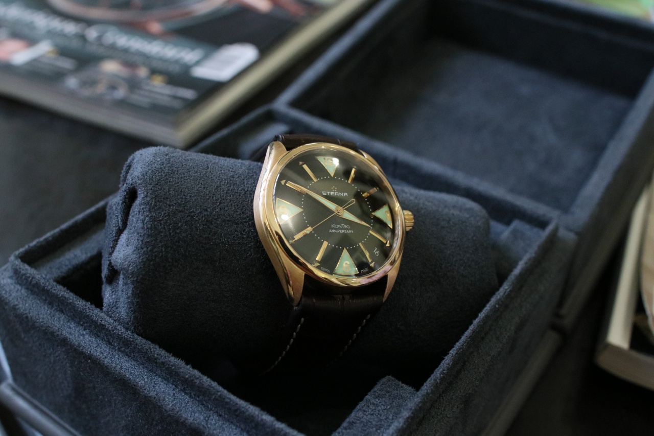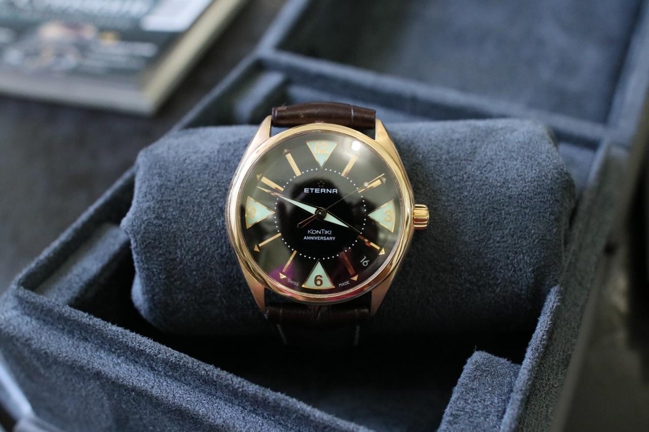 Швейцарские часы серии KonTiki 50 лет тому назад компания Eterna выпустила специально для тихоокеанской экспедиции прославленного норвежского путешественника Тура Хейердала на плоту KonTiki. В честь 50-летия линейки Eterna представляет лимитированные 50 экземплярами часы KonTiki Anniversary в 40-миллиметровом корпусе из розового золота. От оригинала 50-летней давности часы отличаются золотыми корпусом, стрелками и накладными индексами треугольной формы. Из золота изготовлена также и завинчивающаяся задняя крышка с медальоном, на котором изображен плот «Контики». Узор в центре циферблата часов изображает силуэт атолла Раройя, где закончилось путешествие. Часы поставляются на коричневом ремешке из кожи аллигатора с простой золотой застежкой в подарочной коробке из красного дерева, выполненной вручную в виде высокой прямоугольной статуи идола. Часы оснащены автоматическим калибром Eterna 3010 с мгновенно меняющимся индикатором даты. Он представляет собой новую разновидность ультратонкого калибра Eterna 3030 с частотой 28 800 пк/ч и 2-суточным запасом хода.