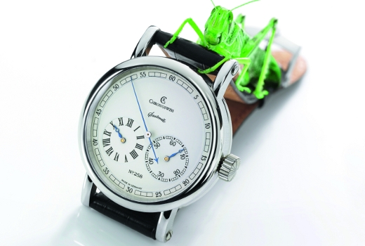 Chronoswiss: рант и нижняя часть состоящего из трех частей корпуса украшены «монетным» рифлением, перемычки для ремешка завинчены, для установки стрелки и завода служит большая заводная головка-луковица, а часовой механизм открыт для обозрения сквозь сапфировое стекло в задней крышке. Для нашего соревнования хронометров