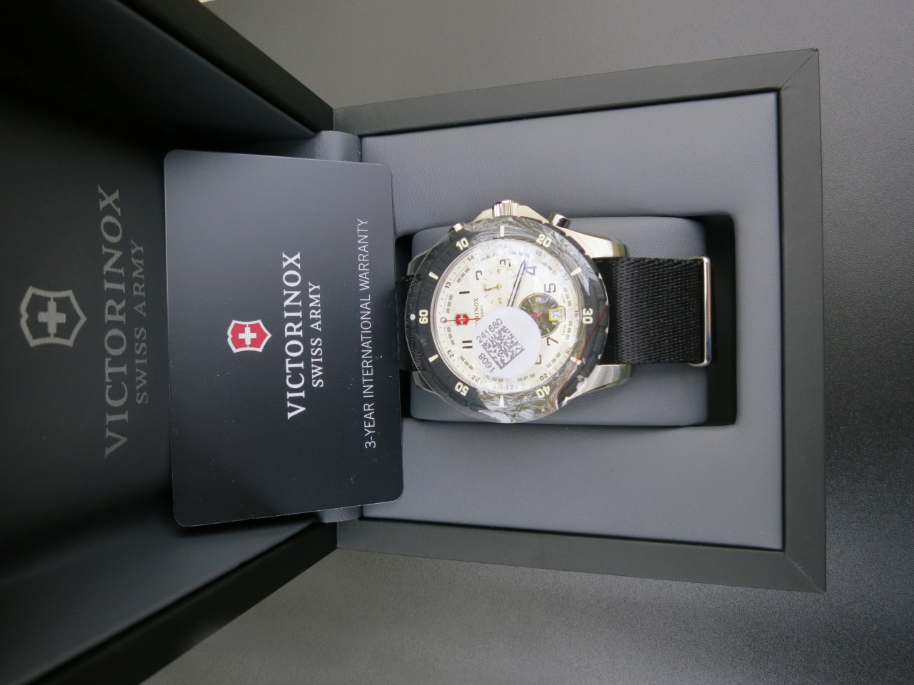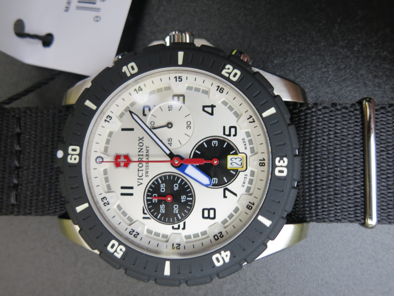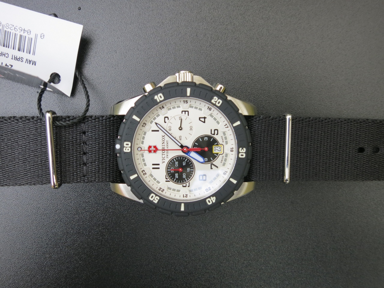 Часы наручные Victorinox Swiss Army 241680.1 Sport Chronograph из коллекции Maverick, швейцарский кварцевый механизм Ronda 5030.D, индикация даты. Стальной корпус, диаметр 43мм, вращающийся безель, люминесцентное покрытие на стрелках и метках, сапфировое стекло с тройным антибликовым покрытием, водоустойчивость 100м, завинчивающаяся задняя крышка, нейлоновый ремешок NATO. Дополнительный нейлоновый ремешок NATO в комплекте.