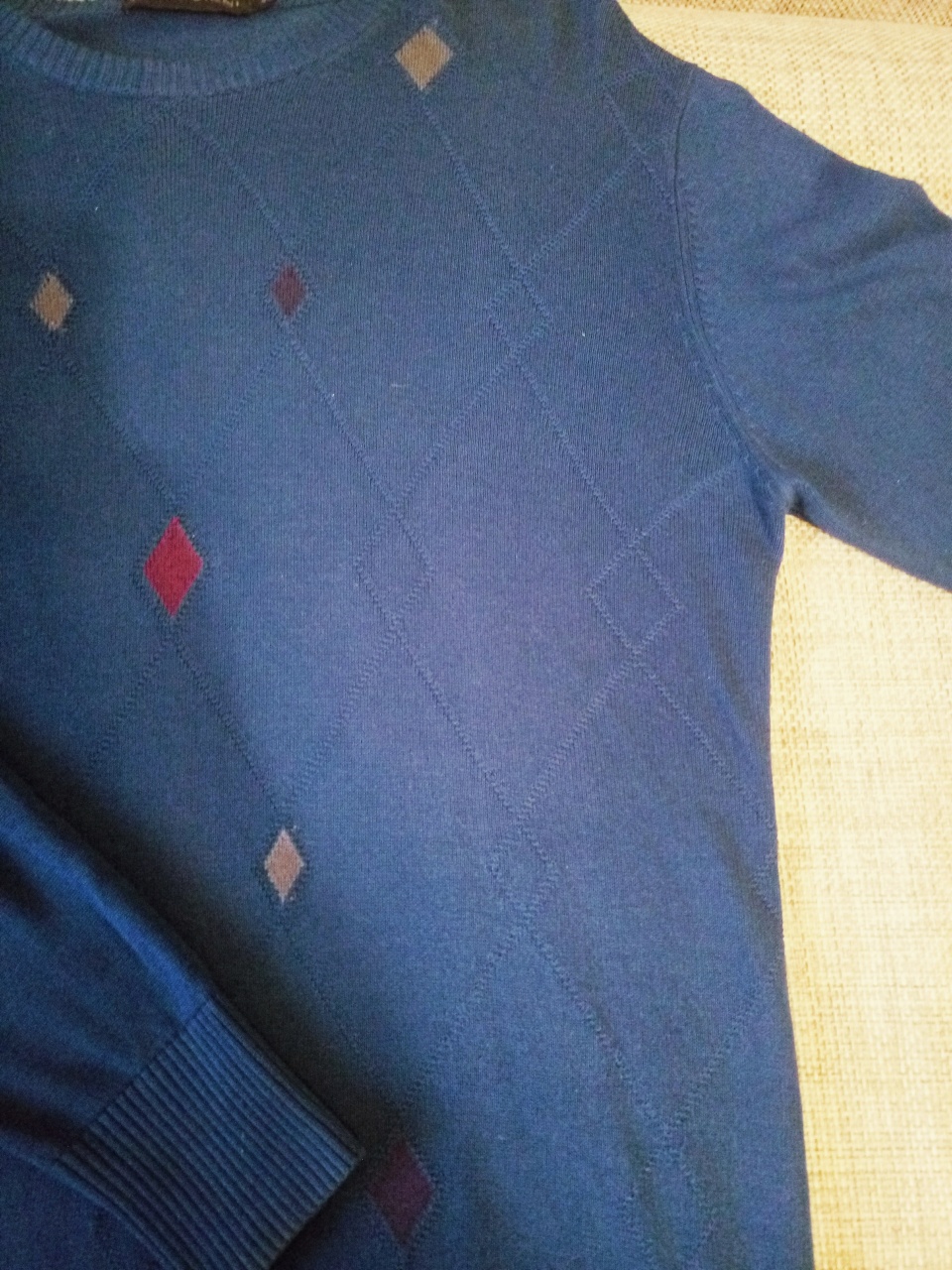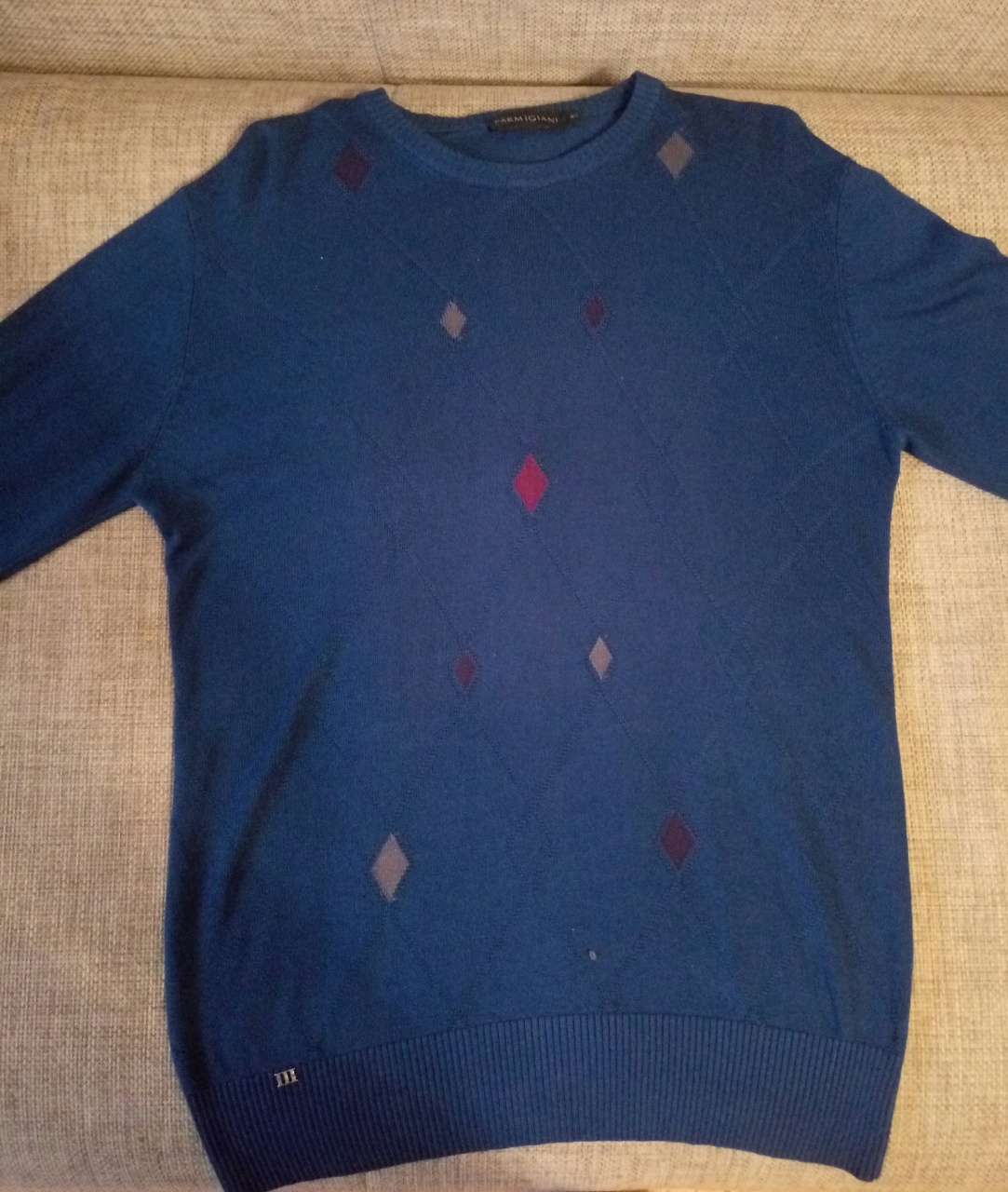 Очень тонкий легкий трикотаж. На рукавах и внизу манжеты. На трикотаже геометрический рисунок маленькими ромбами, разного цвета. На резинке слева есть нашивка-металлический значок пармиджиани.