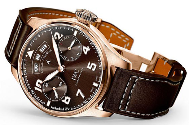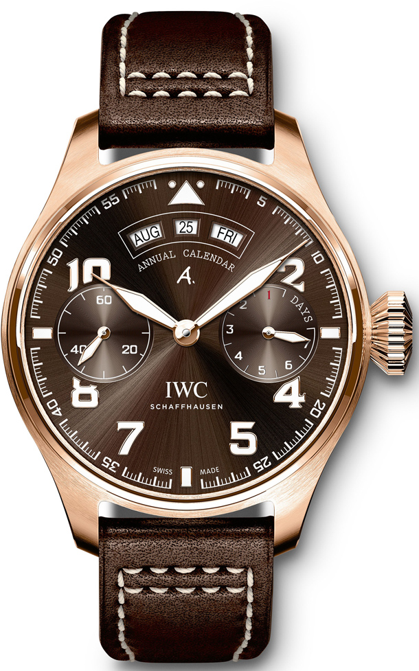 Модель Big Pilot’s Watch Annual Calendar Edition «Antoine de Saint Exupéry» с корпусом из 18-каратного розового золота выходит в специальной серии с уникальным дизайном и посвящается памяти Антуана де Сент-Экзюпери. Циферблат часов, украшенный буквой «А» (от имени Антуан), и ремешок из телячьей кожи табачно-коричневого цвета напоминают летный костюм знаменитого летчика и писателя.