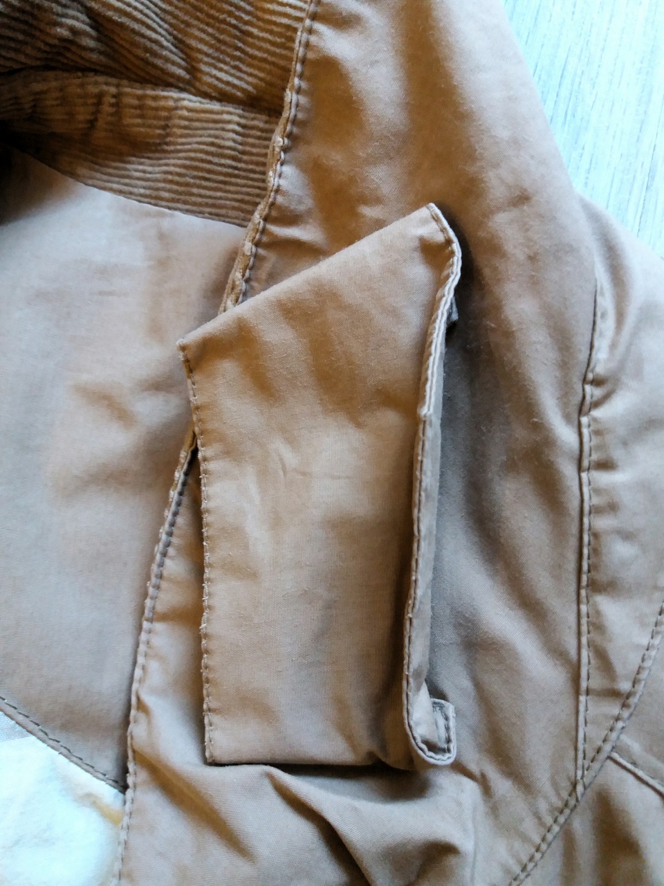 Фирменный клетчатый тартановый подклад, вельветовый воротник, манжеты рукавов изнутри.