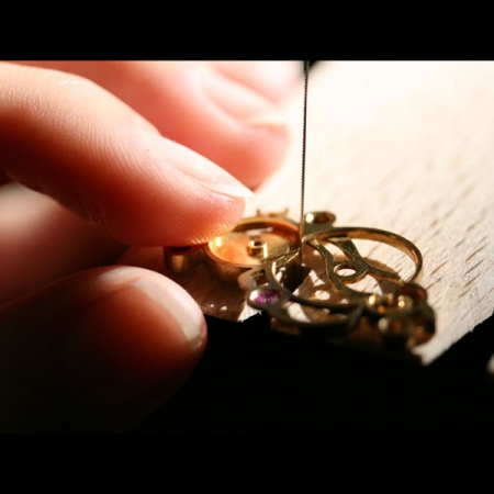 Исходя из первоначальной формы базисной платины и крепёжных мостов, формируется дизайн будущей гравировки в сочетании с конструкторским решением, дабы последующим выпиливанием не нарушить статику будущих часов. Затем карандашный дизайн гравировки переносится на детали механизма при помощи алмазной иглы. Механизм гравируется штихелем вручную при помощи микроскопа, после чего необходимо выпилить оставшиеся, незаполненные гравировкой поверхности. Для этого деталь засверливается микросверлом и нужная поверхность выпиливается тончайшим лобзиком. Готовая деталь покрывается микроскопическим слоем золота, защищающим её от коррозии и придающим магическую притягательность благородного металла.