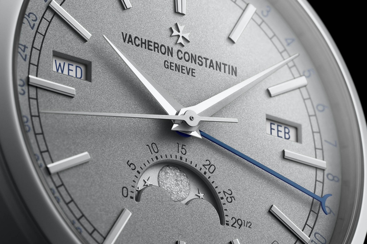 Новинка имеет круглый полированный корпус, изготовленный из платины 950, диаметром 41,00 мм, толщиной 10,72 мм, водонепроницаемый до 30 метров. На торце рифленой заводной головки, расположенной на 3 часах, выгравировано изображение мальтийского креста - эмблемы бренда Vacheron Constantin. Сапфировое стекло установлено на передней стороне часового корпуса и на его завинчивающейся задней крышке. Платиновый циферблат с покрытыми 18-каратным белым золотом, накладными продолговатыми гранеными часовыми маркерами. Модель оснащена мануфактурным швейцарским автоматическим механизмом Vacheron Constantin 2460 QCL, с балансовой частотой 28800 полуколебаний в час (4 гц), 40-часовым запасом хода, функциями индикации часов, минут, секунд (посредством соответствующих центральных стрелок), даты (посредством специальной вороненой центральной стрелки с наконечником в форме полумесяца на соответствующей круглой шкале, размеченной арабскими цифрами и расположенной на периферии циферблата), дня недели и месяца (посредством соответствующих буквенных указателей в прямоугольных апертурах, расположенных на 9:30 и на 14:30 часах) и фаз Луны (посредством соответствующего указателя, расположенного на 6 часах и требующего корректировки один раз каждые 122 года).
