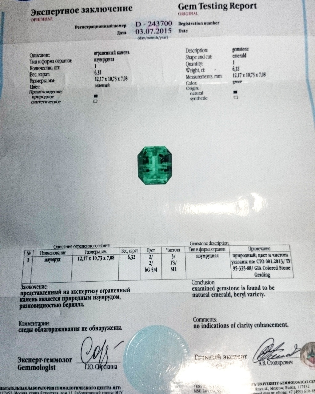 Изумруд 6.32 ct БЕЗ МАСЛА !