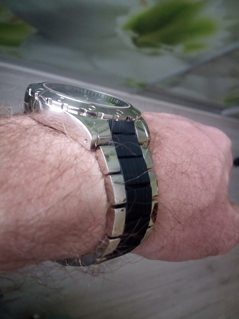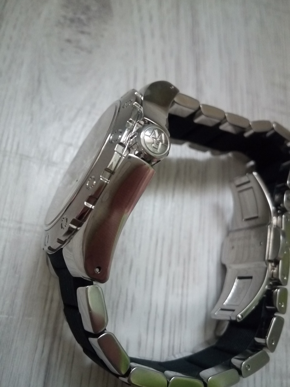 Браслет: сталь+резина на 19,5 см максимум с раскладывающейся застежкой с двумя кнопками.