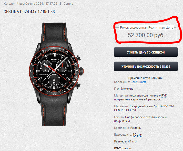 CERTINA DS-2 Precidrive C024.447.17.051.33. Черно-красный кварцевый хрон / Каучук / d=41mm - Часовой форум Watch.ru