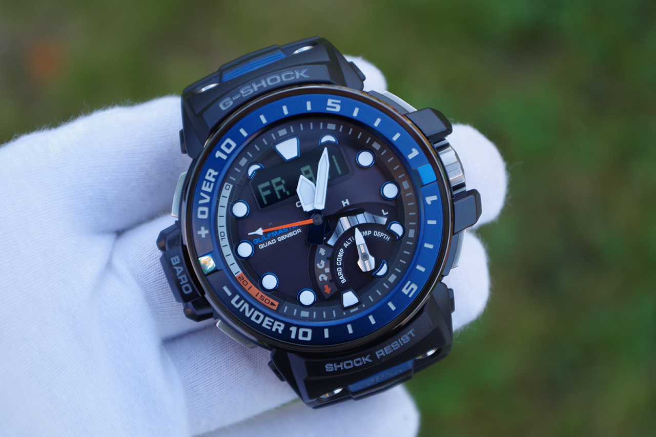 Gulfmaster. Питание от солнечной энергии Tough Solar - солнечные батарейки большой мощности, индикатор заряда батареи. Функция автоматического сохранения энергии. Время работы аккумулятора без подзарядки до 6 месяцев, при включенной функции сохранения энергии до 21 месяца. Противоударный корпус защищает механизм от ударов и вибрации. Циферблат и ЖК дисплей подсвечиваются ярким светодиодом, при недостаточном освещении во время поворота запястья в сторону лица подсветка включается автоматически. Светонакопительное покрытие Neobrite продолжает светиться в темноте даже после непродолжительного пребывания на свету. Технология Multi Band 6 позволяет принимать сигналы от шести радио вышек, расположенных в различных точках земного шара, которые передают временные сигналы от определенных атомных часов. Коррекция текущего времени радиосигналом на территории почти всей Европы, США, Японии и Китая. Функция автоматической коррекции положения стрелок проверяет положение стрелок каждый час и корректирует его в случае необходимости. Технология Quad Sensor позволяет точно и легко определять сторону света, температуру, атмосферное давление/высоту и глубину. Встроенный цифровой компас. Диапазон измерения от 0° до 359° с точностью 1°. Коррекция магнитного склонения. Встроенный датчик температуры от -10° до +60°С с точностью 0,1°C. Барометр - измерение атмосферного давления от 260 до 1100 гПа (от 195 до 825 мм рт. ст.). Высотомер - встроенный датчик барометрического давления с возможностью вывода результатов в единицах высоты над уровнем моря (от -700 до 10000 метров). Глубиномер до -50м, точностью 10см. Автоматический запуск и остановка измерений на глубине 1м. Журнал аквалангиста до 40 записей времени начала погружения, длительности погружения и температуры воды. Система Smart Access с помощью электронной заводной головки обеспечивает простой и удобный доступ ко всем важным функциям часов. Нажатие или поворот заводной головки позволяет переключаться между различными режимами и активировать будильник, таймер, секундомер, а также настраивать функцию мирового времени. Отображение возраста и фазы Луны. Графическое отображение сведений о приливах и отливах на заданную дату и время. Мировое время – 48 городов (31 часовой пояс), всемирное координированное время (UTC). Автоматический переход на зимнее и летнее время, возможность включения/отключения данной функции. Время восхода и захода Солнца. 12-ти и 24-х часовой формат времени. Секундомер с точностью показаний 1/100с и временем измерения 24ч. Сплит-хронограф. Таймер обратного отсчета от 1мин до 1ч. Функция включения/отключения звука. Стальной безель с IP покрытием. Завинчивающаяся заводная головка с защитой.