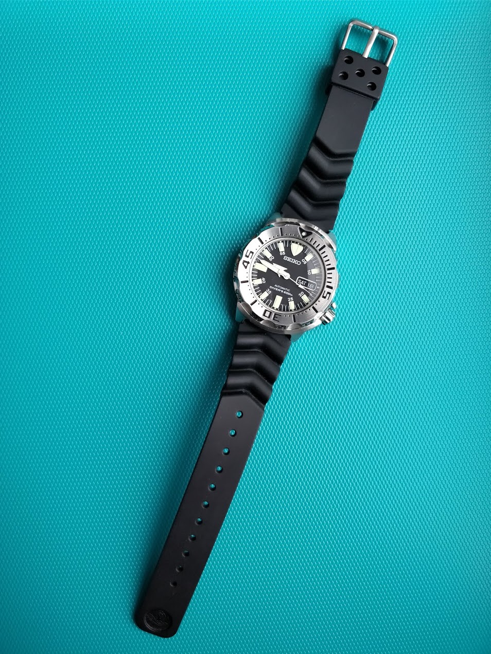 Продаются Seiko Black Monster на неоригинальном каучуке (ремень использовался раз 10-15). Куплены были аж в 2009, но большую часть времени носились изредка. Не вскрывались. Следы эксплуатации присутствуют, но без криминала. На стекле из недочетов только "точка" на 8 часов (видна на фото).