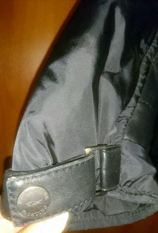 Нейлонавая куртка комбинированная натуральной кожей. Капюшон убирается в воротник (тонкий - нейлон). Стяжки на рукавах (манжеты) и по низу. Модель из коллекции 10-летней давности. Кому нравится строгий современный стиль - эта куртка для Вас.