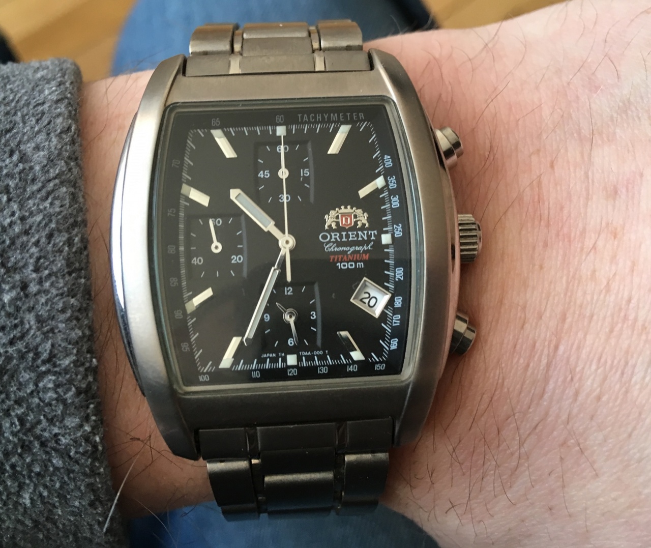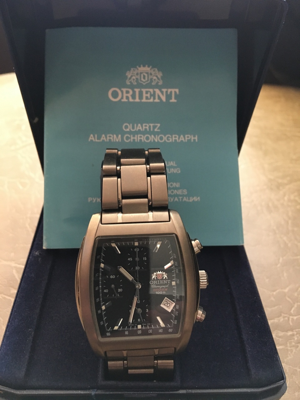 Продается наилегчайший титановый хронограф с будильником Orient Titan Chrono в ИДЕАЛЬНОМ СОСТОЯНИИ. Ни царапин, ни следов следов носки. Браслет с полным комплектом звений. Батарейки хватает на 3 года. Проверено.