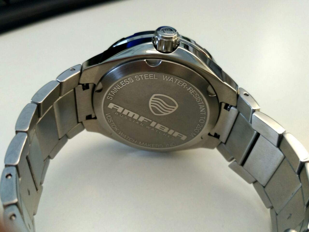Корпус очень толстый, на руке как башня. Скосы по бокам прячут высоту и на руке смотрится хорошо, но он реально высоченный. И тяжелый. часы с браслетом весят больше 200 граммов! Мне тяжесть часов нравится, но многих она может просто шокировать. При диаметре среднеразмерок и 200+ граммов! Еще о таком весе одна мысль. Опасаюсь, что даже легонько взмахнув рукой и задев ими что-то твердое, таким тяжелым часам можно нанести существенный ущерб. Всё ж заполировано, кроме верхней части ушек, которые являются продолжением браслета и металл, конечно же, не от брони подводных лодок третьего рейха за такие-то деньги, царапается легко. Я проехал уже по боковине (не понял чем) и там теперь незаметный ни для кого кроме меня штрих. Говорят, чем раньше "коцнешь", тем дольше будешь носить без проблем. Ок, я себя успокоил. Задняя крышка - сатин, с барельефом из полированных надписей на английском. Эмблема обновленной амфибии. Лаконично, стильно.