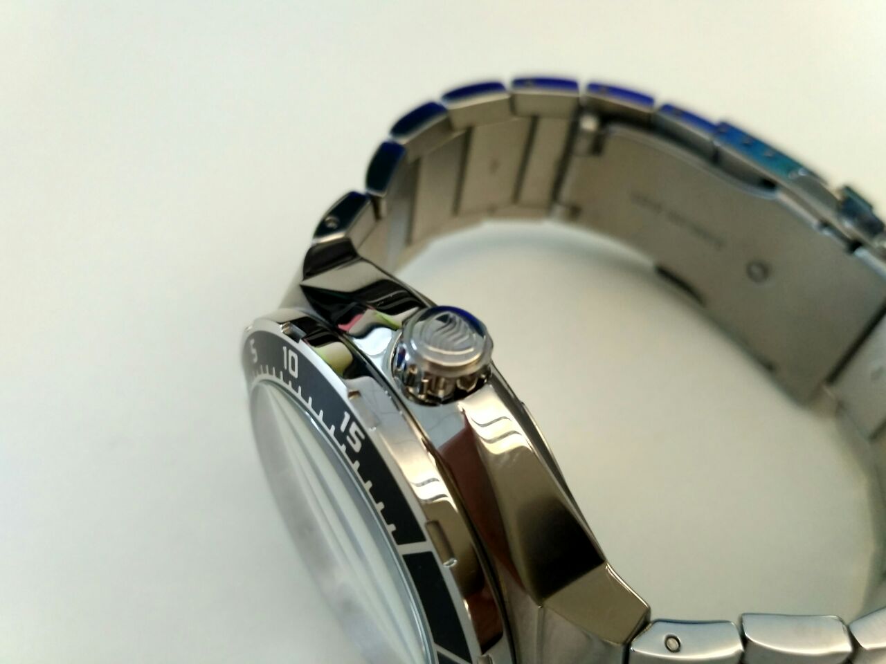 Безель очень приятно щелкает. Очень. Моя дочь готова слушать его часами. Щелчки безеля и шум цикад в ее возрасте - любимые звуки. Классное решение - полированные металлические цифры с мелкими штрихами от 0 до 20 на каждую минуту и потом четки штрихи по десяткам через всю ширину. Цифры 5 - 10 - 15 - 30 - 45, светонакопитель на начале отсчета в форме пятиугольного вымпела. Смотрится здорово. Выемки заполнены по-моему черной эмалью (или это керамика?). Опасаюсь, что достаточно легко поцарапать, но смотрится просто великолепно. Как мозаика что-ли. Индексы и цифры очень интересно смотрятся в игре света. Они видны не всегда и временами вспыхивают отражениями, заявляя о себе. В статике фото этого к сожалению практически не видно. Один минус-не минус, но визуально центровка отметки безеля на 12 как-то вызывает сомнения. Видимо, из-за толщины минерального стекла механизм внутри корпуса посажен очень глубоко. Этот дает эффект (я все же думаю, что это иллюзия) неполного совпадения рисок безеля с рисками циферблата.