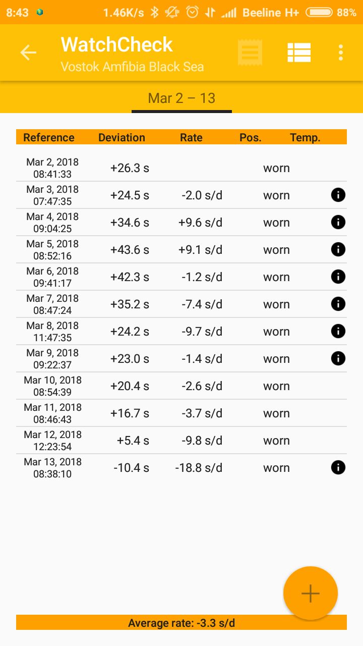 К концу недели прогрессирует отставание. На картинке видно, что через сутки после того как завел отставание не больше пары секунд в день, на 5-6 сутки 9 секунд. На следующие - еще сильнее. Связываю это все с той же пружиной и режимом ношения (спокойная офисная крыса), при котором автоподзавод сутки за сутками постепенно её не докручивает.