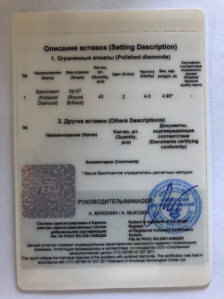 Бриллианты огранки смоленского завода "Кристалл", аттестат ювелирного изделия прилагается, как и подарочный бокс.