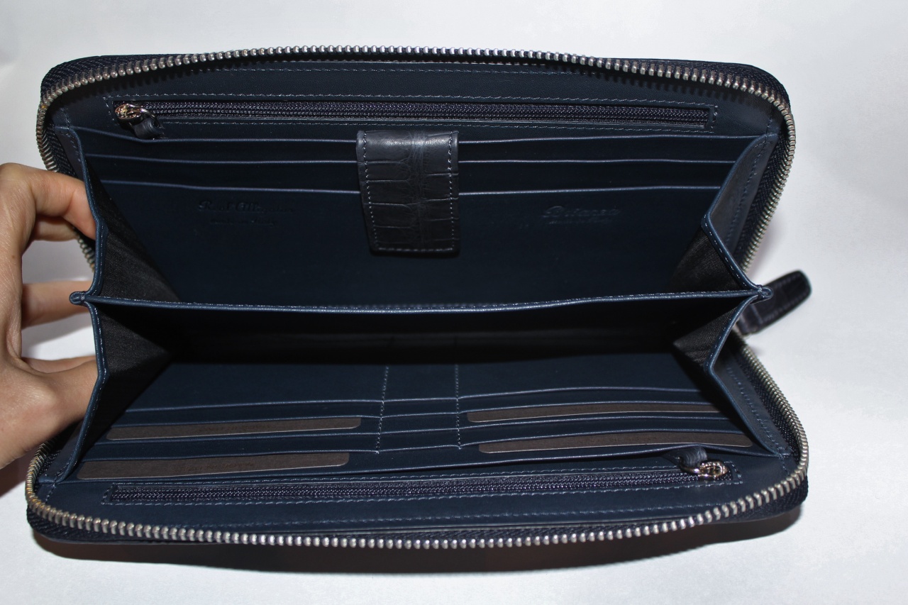 Клатч застегивается на молнию серебристого цвета и имеет два больших отделений для банкнот, восемь отделений для кредитных карт или визиток, отделение для паспорта, авиабилета, водительских прав, и других документов.