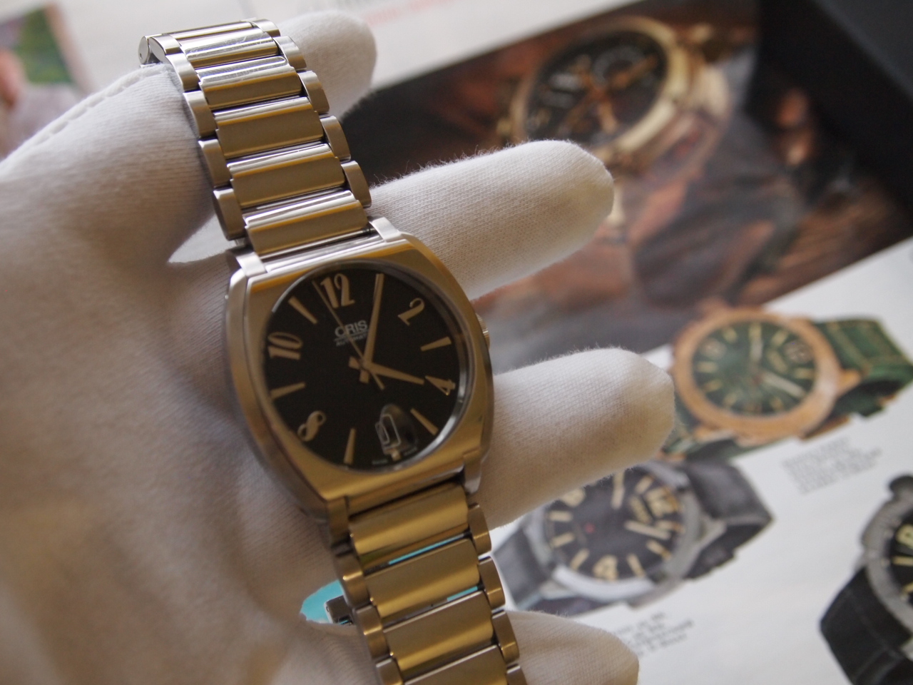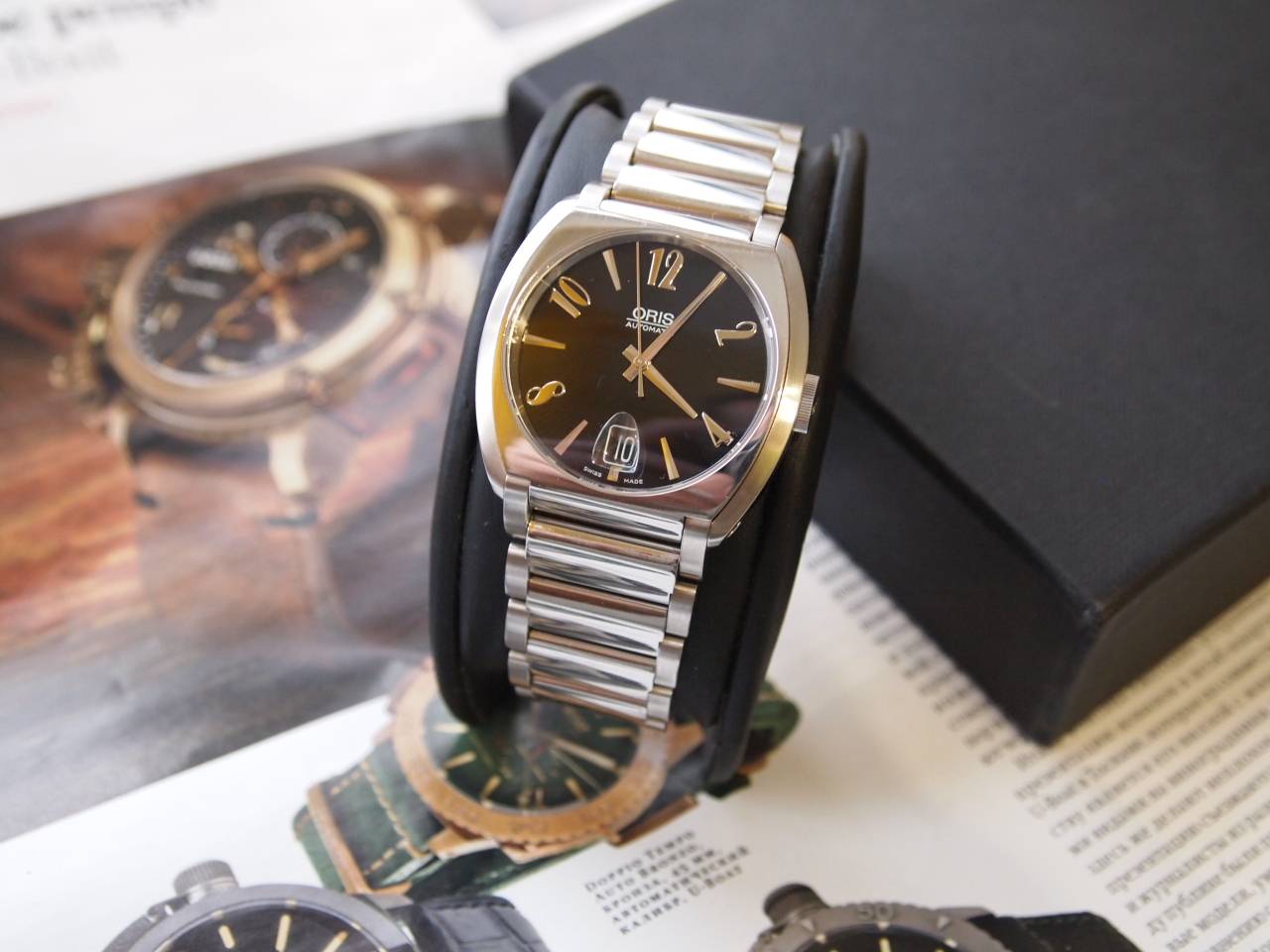 Стрелки приводит в движение калибр Oris 733, на 26-ти камнях, запас хода 38 часов, сапфировое стекло с обеих сторон, антиблик, лупа на дате, фирменный красный ротор, защита от воды 3 бар, браслет.
