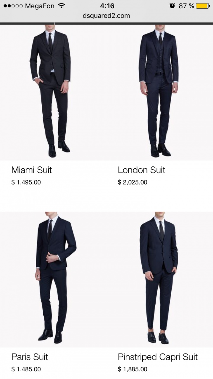 Стоимость костюмов Dsquared2 на официальном сайте в среднем 1800$