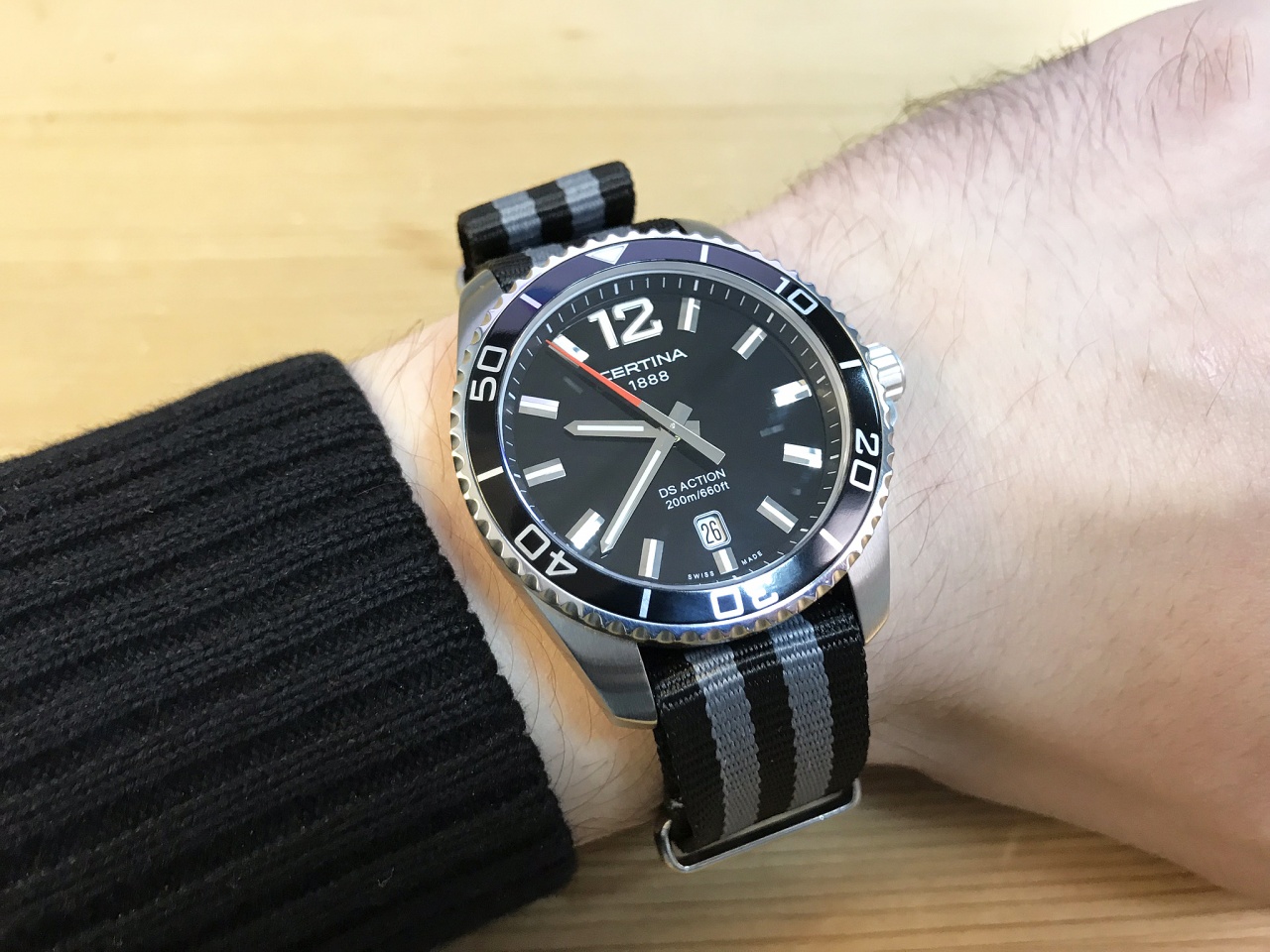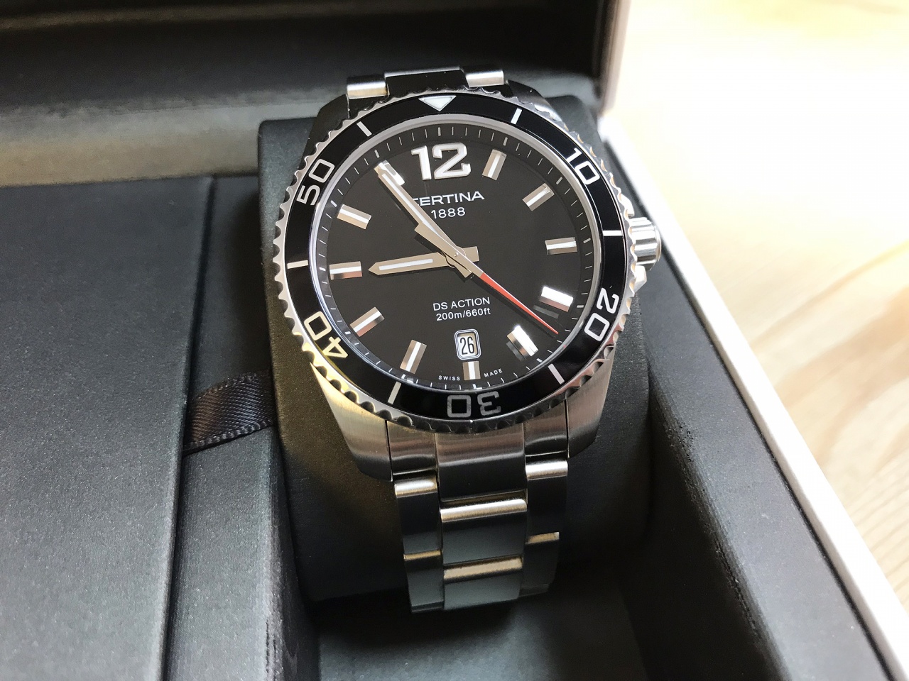Часы в отличном состоянии. Недавно заменил батарейку в официальном сервисном центре. В комплекте: фирменная коробка Certina со всеми книжечками, дополнительные звенья для браслета, тканевый браслет Nato (расцветка а-ля Джеймс Бонд), чек на замену батарейки.
