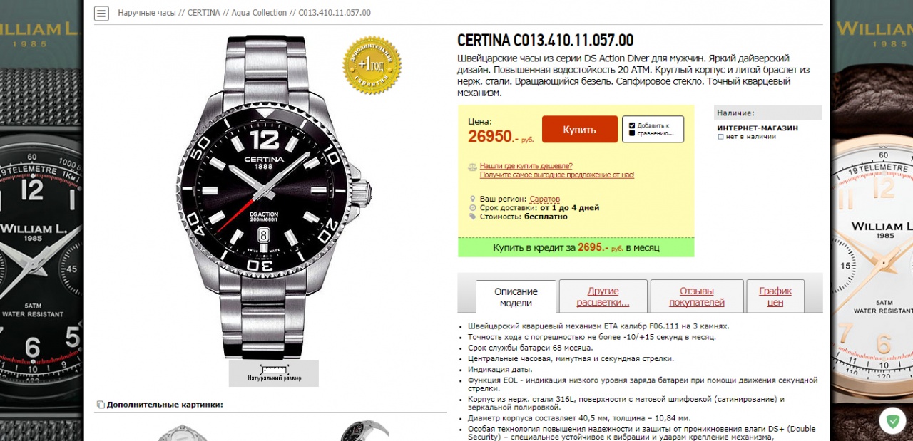 Отличные дайверские часы со строгим дизайном. Будут смотреться уместно как с классическим костюмом, так и с шортам на пляже. Идеальный вариант в качестве первых швейцарских часов. Носил их мало, надевал в основном под настроение. Решил попробовать механику, из-за чего эти и приходится продавать.