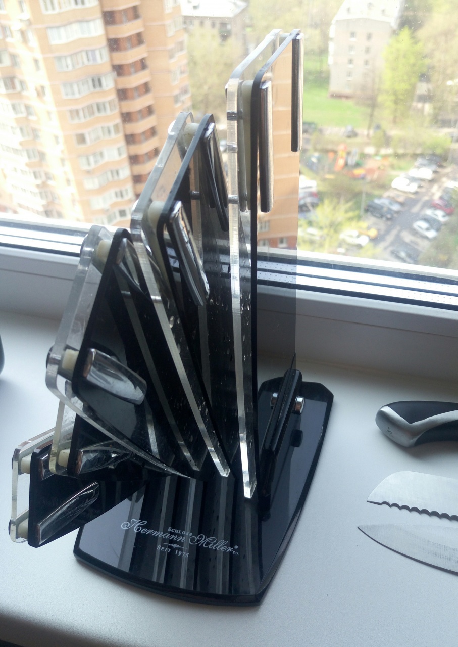 Комплект из 5 кухонных ножей от Hermann Miller на подставке.