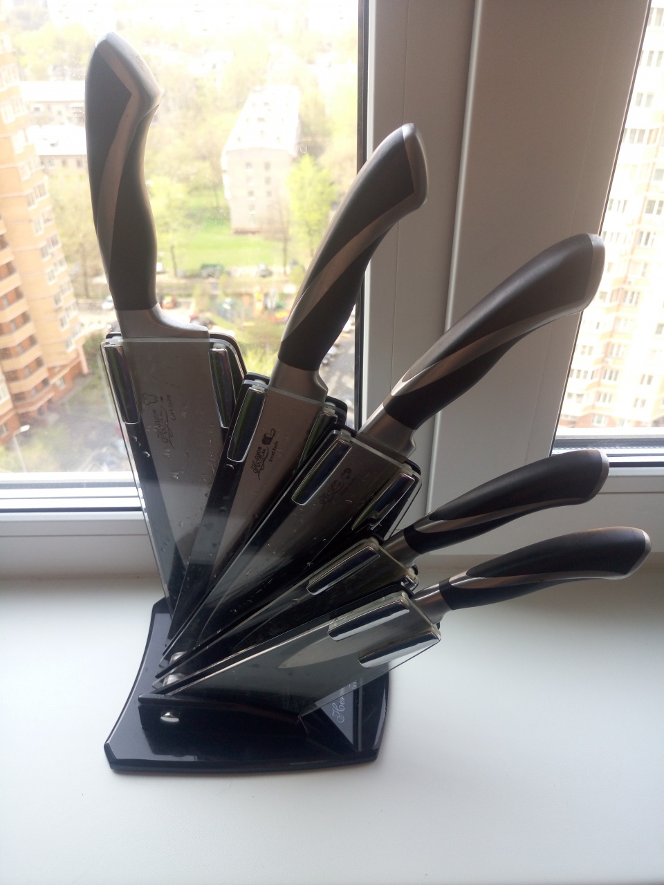 Ножи выполнены из нержавеющей стали с удобной нескользящей рукоятью. Подставка из глянцевого черного пластика с металлическими деталями.