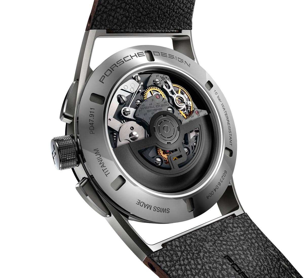 Новинка имеет круглый корпус, изготовленный из титана, диаметром 42,0 мм, толщиной 14,9 мм, водонепроницаемый до 100 метров. На торце завинчивающейся рифленой заводной головки, расположенной на 3 часах, выгравирован логотип бренда Porsche Design. Пушеры хронографа размещены на 2 и 4 часах. Безель тонкий фиксированный. Сапфировое стекло установлено на передней стороне часового корпуса (выпуклое, с двусторонним антибликовым покрытием) и на его завинчивающейся задней крышке. Циферблат коричневого цвета, с часовыми индексами, часовой и минутной стрелками, покрытыми белым люминесцентным составом. Наконечники стрелок хронографа - контрастного красного цвета. На фланце расположена секундная шкала. Модель оснащена автоматическим механизмом Werk 01.200, с балансовой частотой 28800 полуколебаний в час (4 гц), 48-часовым запасом хода, вольфрамовым ротором автоподзавода, официально сертифицированным COSC (Contrôle Officiel Suisse des Chronomètres) в качестве хронометра, с функциями индикации часов, минут (посредством соответствующих центральных стрелок), даты (посредством соответствующего цифрового указателя в прямоугольной апертуре, расположенной на 4 часах), с указателем хода калибра (в полукруглой апертуре, расположенной на 9 часах), а также с Flyback-хронографом (центральная секундная стрелка, круглый аналоговый 30-минутный счетчик, расположенный на 12 часах и круглый аналоговый 12-часовый счетчик, расположенный на 6 часах).