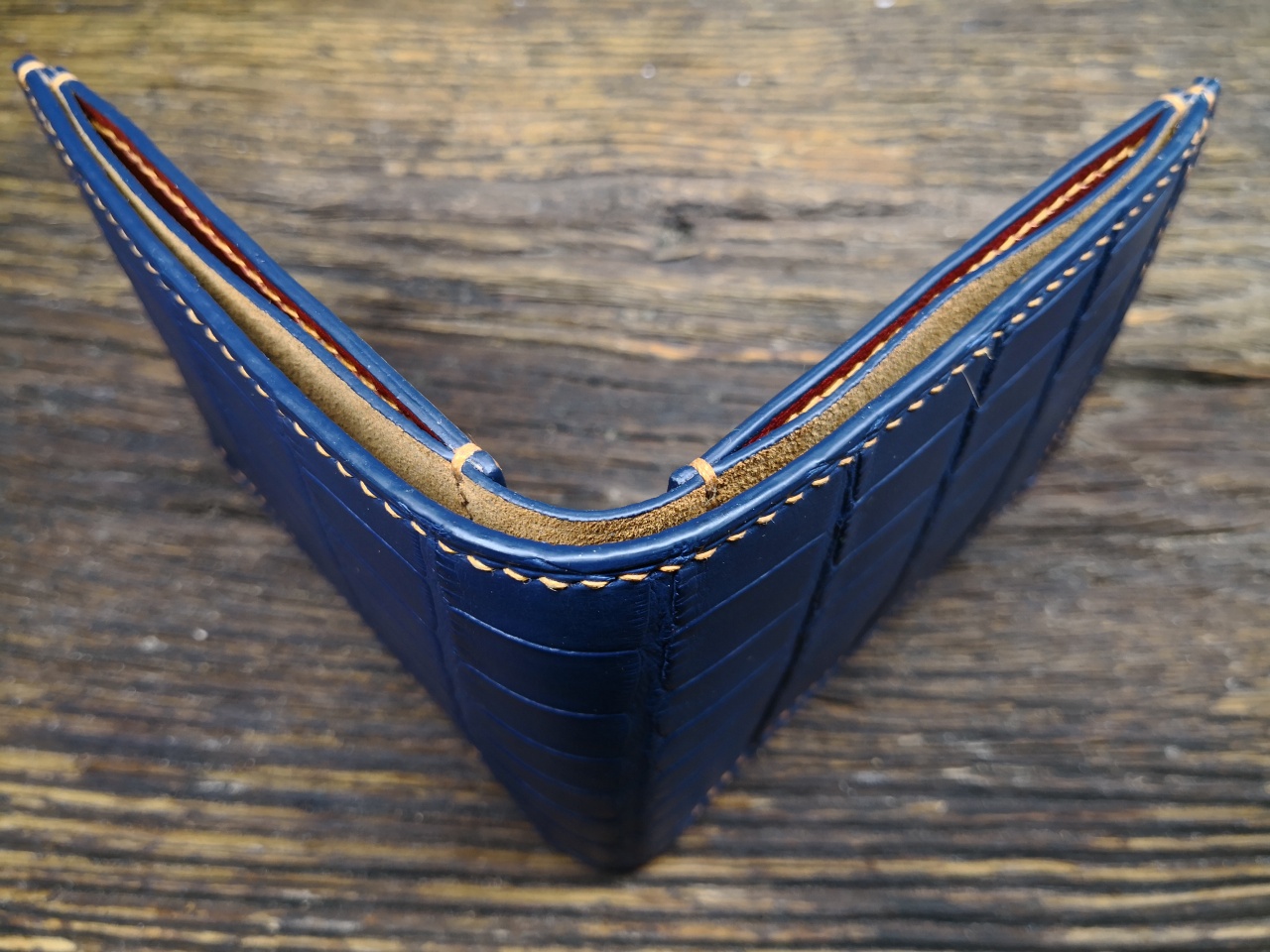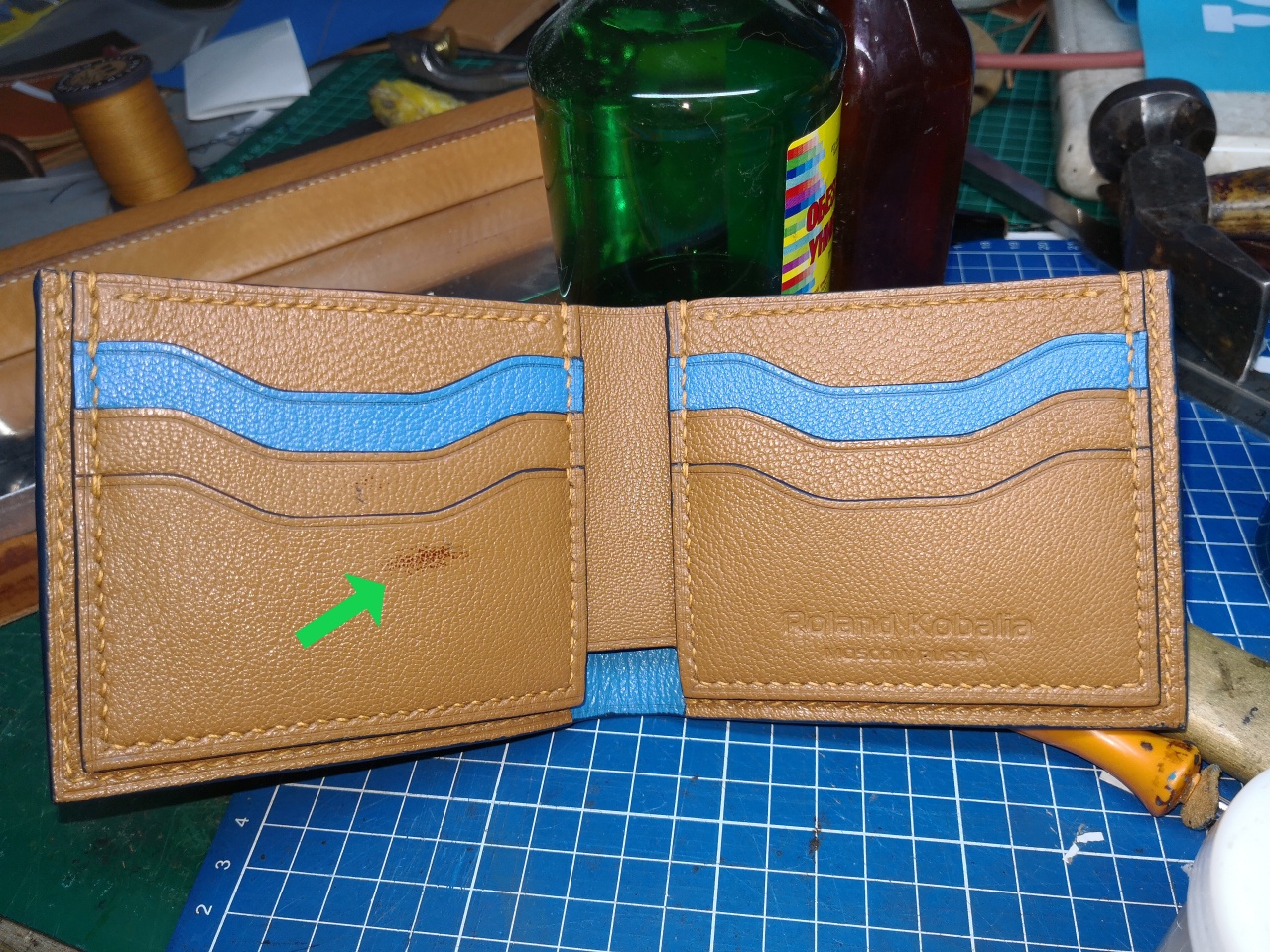 Почему 97% качества. Уже на готовом кошельке «вдруг случилось» небольшое пятнышко. Это ещё раз подтверждает, что ручная работа эксклюзивна и сложна. И в отличии от фабричных работ, есть вероятность такой случайности.