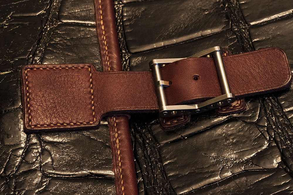 Основная кожа - гигантский африканский крокодил итальянкой выделки - редчайший экземпляр кожи. Их него сделаны передняя часть и задняя часть вместе с клапаном из единого куска длиной около 50 см.