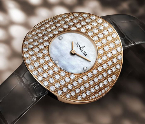 Корпус инкрустирован белыми перламутровыми кабошонами, а над отметкой «12» расположена рифлёная головка подзавода. По желанию покупателя циферблат может быть полностью украшен бриллиантами или трёмя бриллиантами на отметках 3, 6 и 9 часов на белом перламутровом фоне. Часы оснащены кварцевым механизмом CO137.