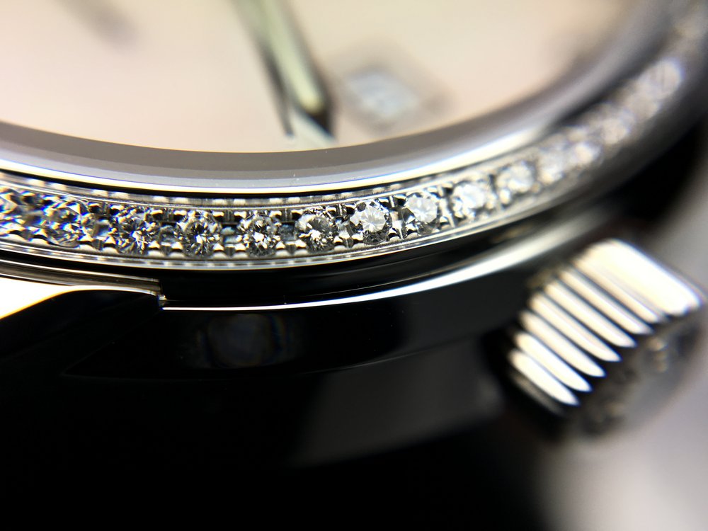 Корпус и перламутровый циферблат украшен бриллиантами: