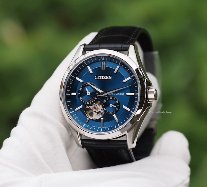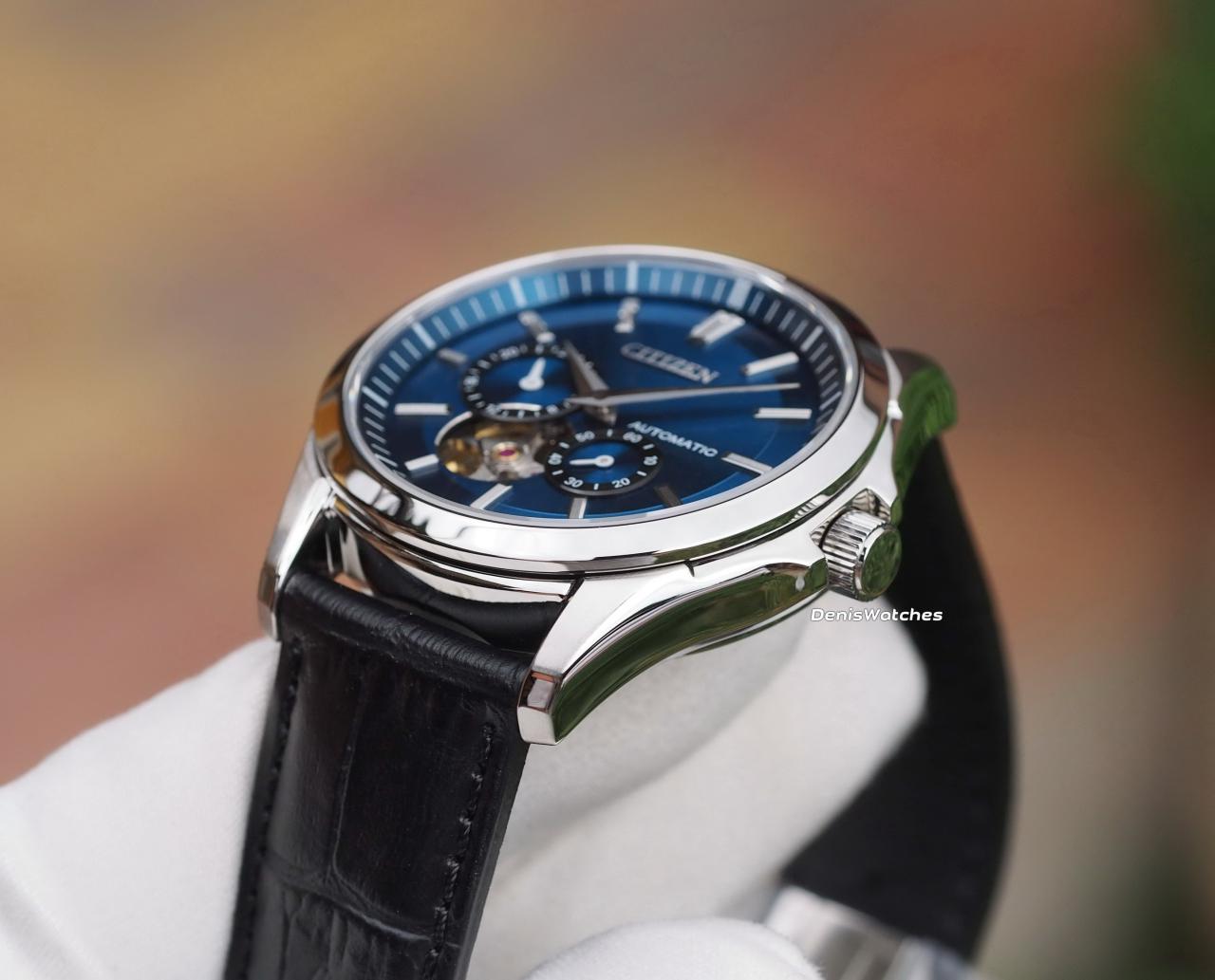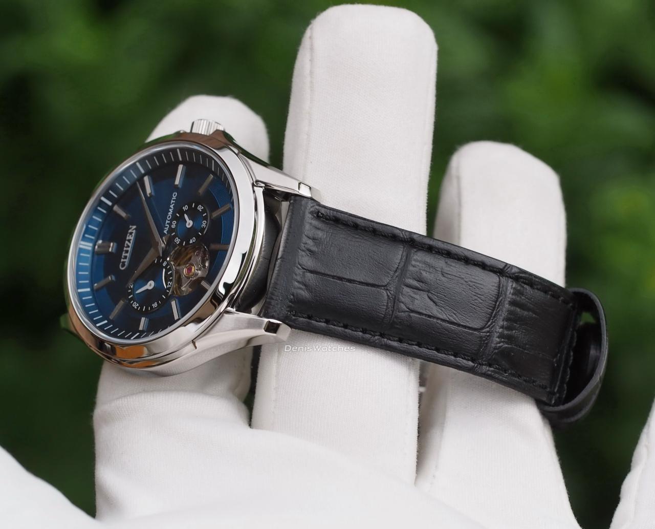 Красивый синий циферблат, полированные стрелки и черный кожаный ремень с клипсой