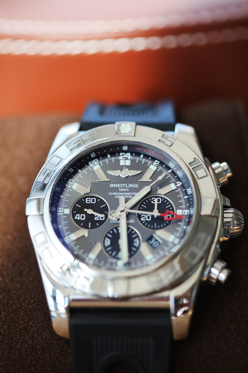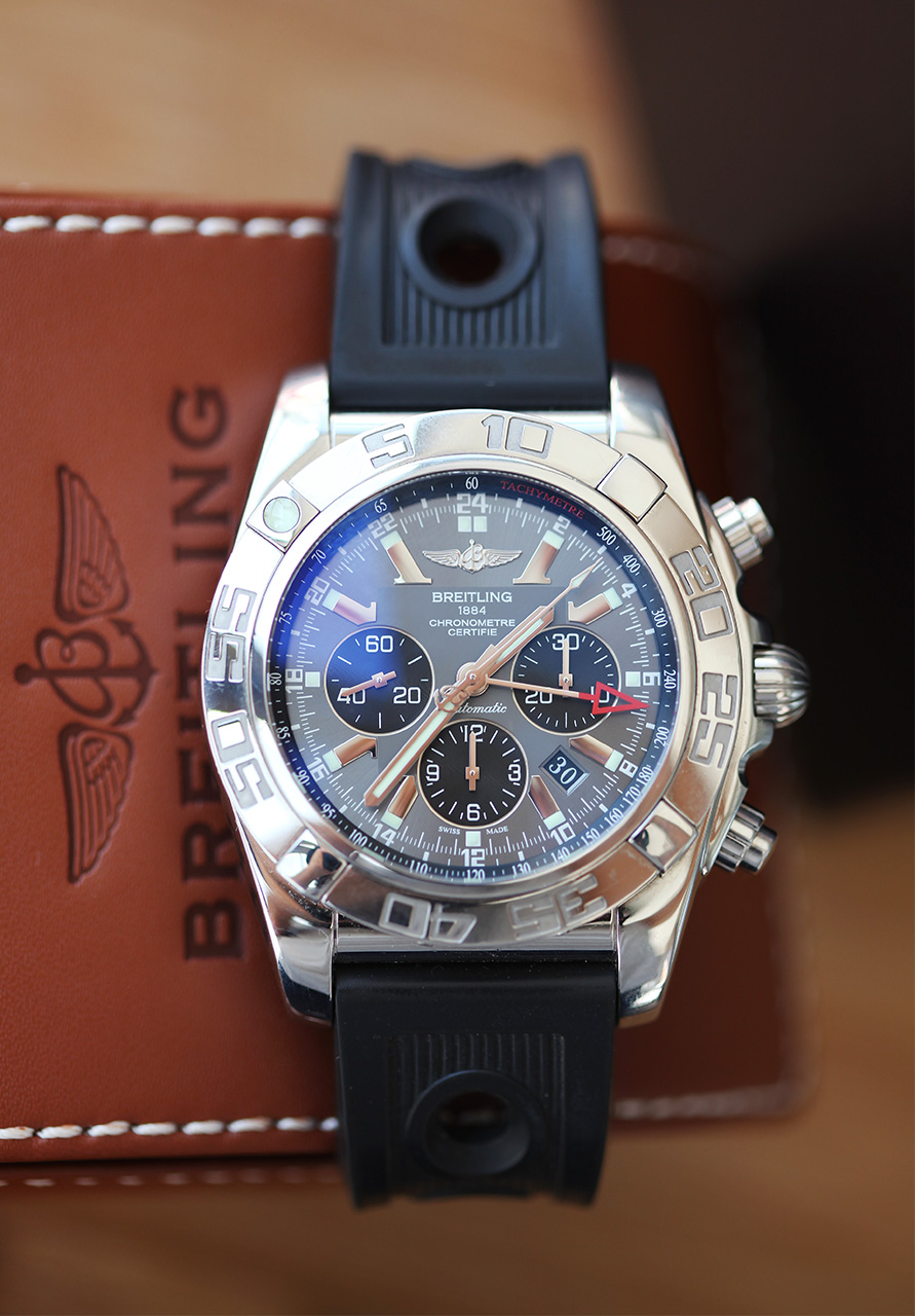 В продаже брутальный Breitling Chronomat Chronograph GMT, в самом большом размере 47мм. Редкий серый циферблат! Каучук на запястье до 19 см