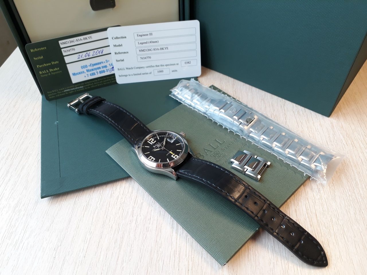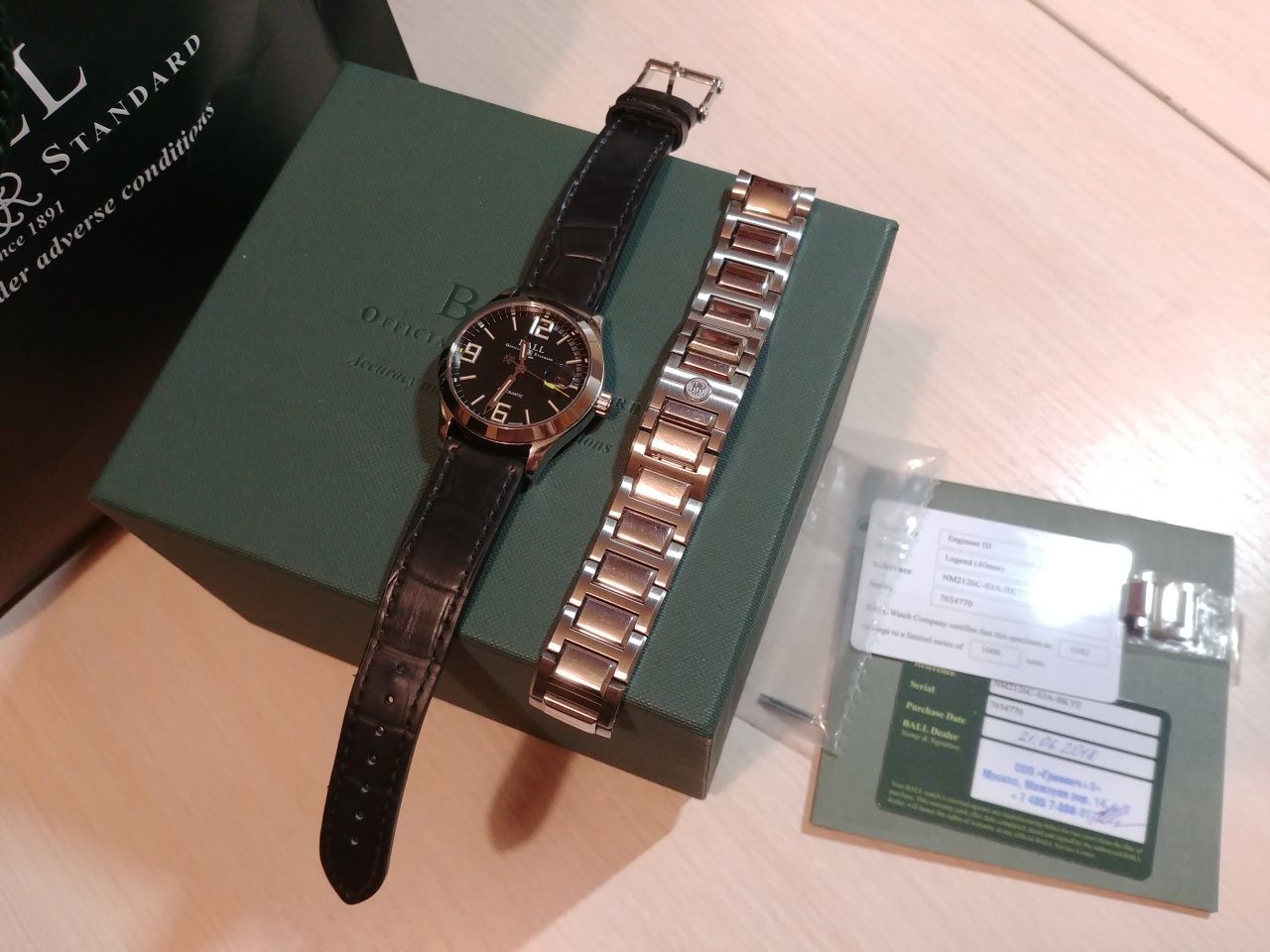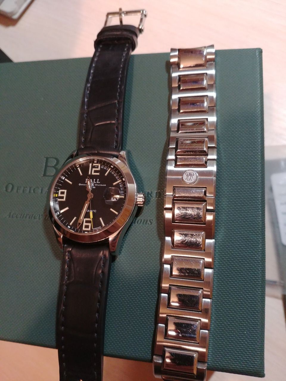 Продам отличные часы полученные по предзаказу в этом году в июне. Механизм BALL RR 1101, на основе ETA 2892. Антимагнитная защита до 80 000 а/м. Размер корпуса 40 мм. Тритиевая подсветка желтого цвета. Ход отличный, около +2 сек в сутки, при активной носке. Родной браслет изрядно поцарапан, на самом деле он просто полированный и царапается от взгляда (ничего страшнее офисного поюза часам не доставалось). В комплекте отдам отличный оригинальный резиновый ремешок с оригинальной стальной баклей. Ремешок сделан под крокодила, с обратной стороны так и не отличишь от кожи. Ремешок носился буквально один день. На корпусе часов только микроцарапки, которые возможно разглядеть только с лупой.
